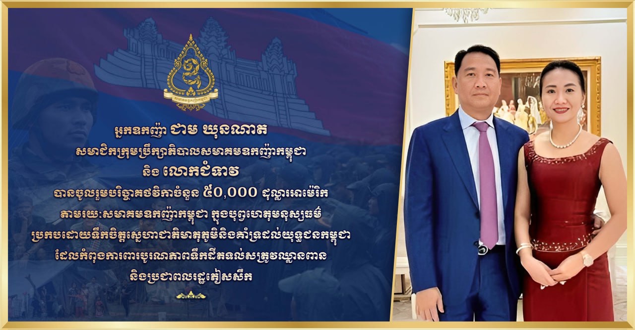អ្នកឧកញ៉ា ជាម ឃុនណាត សមាជិកក្រុមប្រឹក្សាភិបាល នៃសមាគមឧកញ៉ាកម្ពុជា និងលោកជំទាវ បានចូលរួមបរិច្ចាគថវិកាចំនួន ៥០,០០០ ដុល្លារអាម៉េរិក តាមរយៈសមាគមឧកញ៉ាកម្ពុជា ក្នុងបុព្វហេតុមនុស្សធម៌ ប្រកបដោយទឹកចិត្តស្នេហាជាតិមាតុភូមិ និងគាំទ្រដល់យុទ្ធជនកម្ពុជាដែលកំពុងការពារបូរណភាពទឹកដីតទល់សត្រូវឈ្លានពាន និងប្រជាពលរដ្ឋភៀសសឹក។