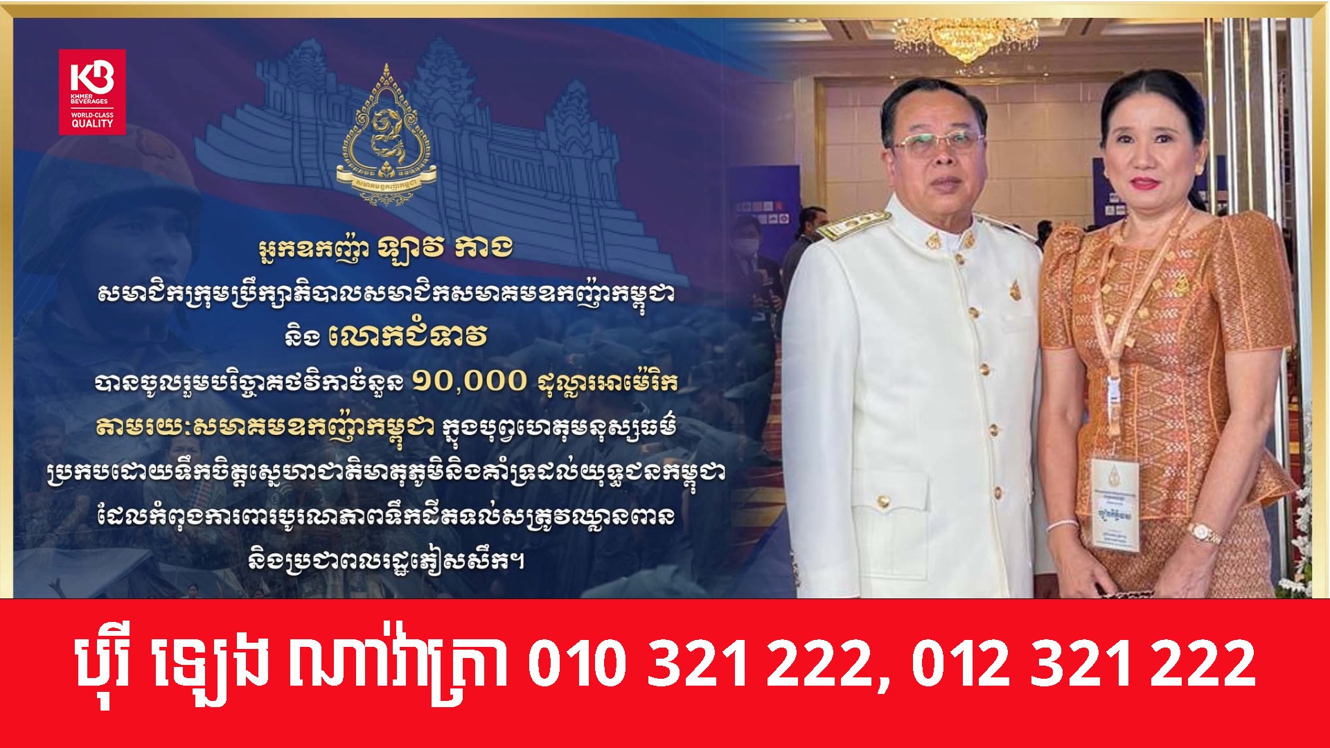 អ្នកឧកញ៉ា ឡាវ កាង សមាជិកក្រុមប្រឹក្សាភិបាល នៃសមាគមឧកញ៉ាកម្ពុជា និងលោកជំទាវ បានចូលរួមបរិច្ចាគថវិកាចំនួន ១០,០០០ ដុល្លារអាម៉េរិក តាមរយៈសមាគមឧកញ៉ាកម្ពុជា ក្នុងបុព្វហេតុមនុស្សធម៌ ប្រកបដោយទឹកចិត្តស្នេហាជាតិមាតុភូមិ និងគាំទ្រដល់យុទ្ធជនកម្ពុជាដែលកំពុងការពារបូរណភាពទឹកដីតទល់សត្រូវឈ្លានពាន និងប្រជាពលរដ្ឋភៀសសឹក។
