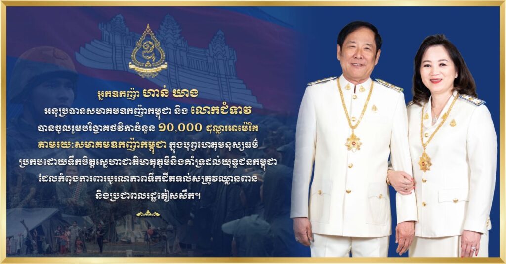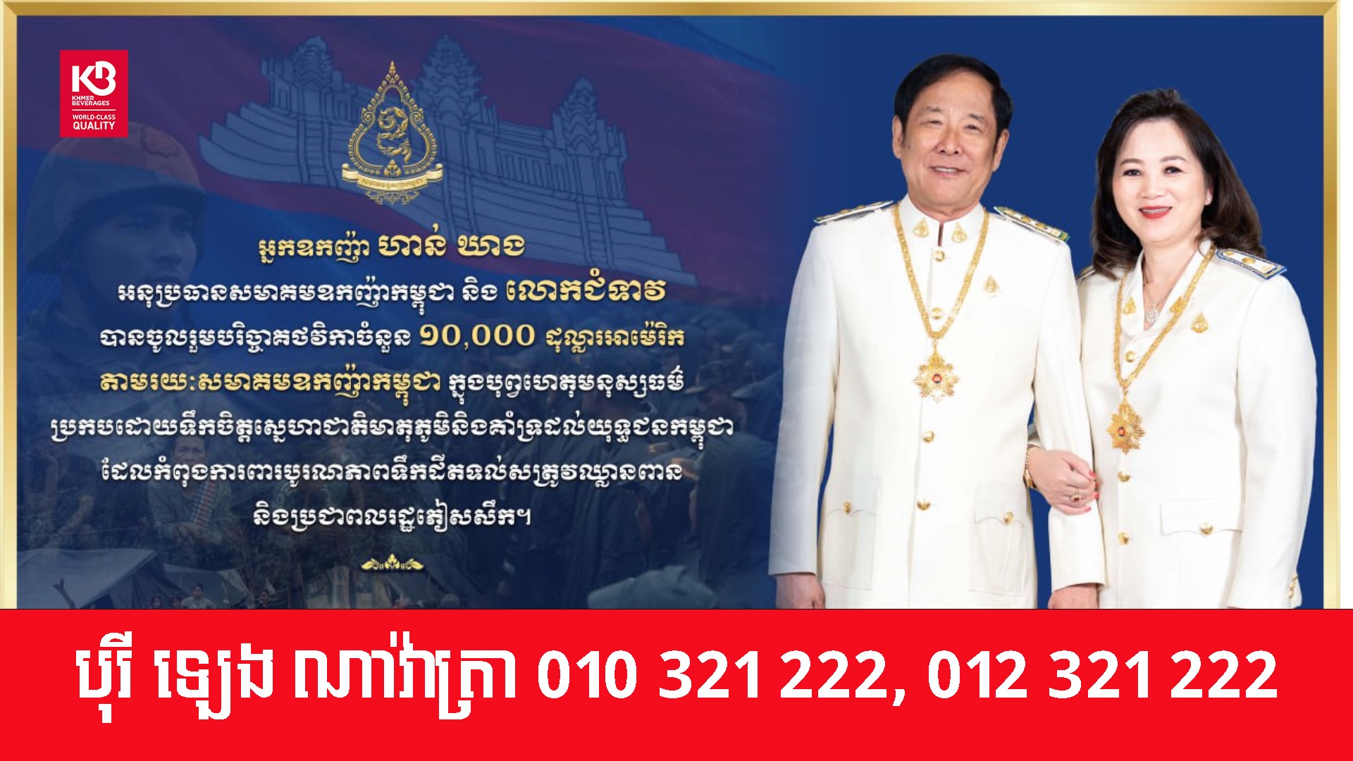 អ្នកឧកញ៉ា ហាន់ ឃាង អនុប្រធានសមាគមឧកញ៉ាកម្ពុជា និងអ្នកឧកញ៉ា លឹម សុខលី បានចូលរួមបរិច្ចាគថវិកាចំនួន ១០,០០០ ដុល្លារអាម៉េរិក តាមរយៈសមាគមឧកញ៉ាកម្ពុជា ក្នុងបុព្វហេតុមនុស្សធម៌ ប្រកបដោយទឹកចិត្តស្នេហាជាតិមាតុភូមិ និងគាំទ្រដល់យុទ្ធជនកម្ពុជាដែលកំពុងការពារបូរណភាពទឹកដីតទល់សត្រូវឈ្លានពាន និងប្រជាពលរដ្ឋភៀសសឹក។