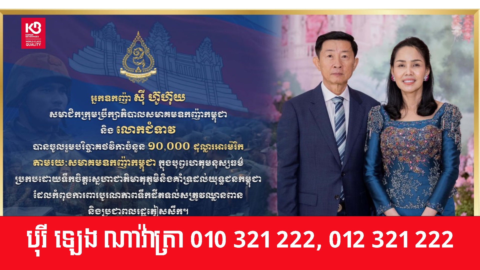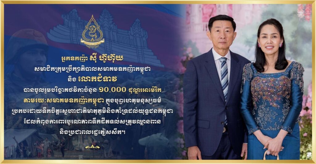 អ្នកឧកញ៉ា ស៊ី ហ៊ូហ៊ុយ និងលោកជំទាវ ចូលរួមឧបត្ថម្ភថវិកា ១០,០០០ ដុល្លារអាម៉េរិក ដល់កងទ័ពជួរមុខ ដែលកំពុងឈរជើងការពារបូរណភាពទឹកដីកម្ពុជា