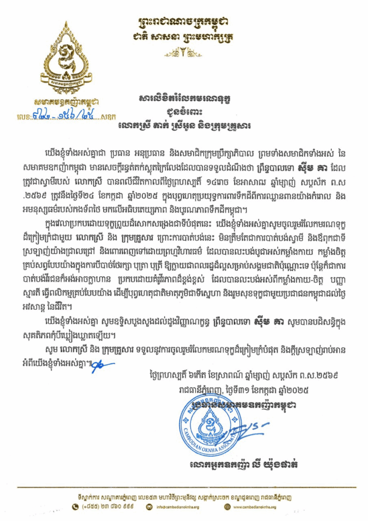 នៅរសៀលថ្ងៃសុក្រ ទី១ ខែសីហា ឆ្នាំ២០២៥ អ្នកឧកញ៉ា អ៊ាន អេឡែន អនុប្រធាន និងជាតំណាងលោកអ្នកឧកញ៉ា លី យ៉ុងផាត់ ប្រធានសមាគមឧកញ៉ាកម្ពុជា បានដឹកនាំគណៈប្រតិភូសមាគមឧកញ៉ាកម្ពុជាដែលរួមមានសមាសភាព អ្នកឧកញ៉ា និងឧកញ៉ា ជាច្រើនរូប ចូលរួមគោរពវិញ្ញាណក្ខន្ធ លោកព្រិន្ទបាលទោ ស៊ីម គា ជាយោធិននៃកងពលតូចអន្តរាគមន៍លេខ៨ ដែលបានពលីជីវិតក្នុងបុព្វហេតុការពារបូរណភាពទឹកដីតទល់នឹងកងទ័ពឈ្លានពានសៀម។