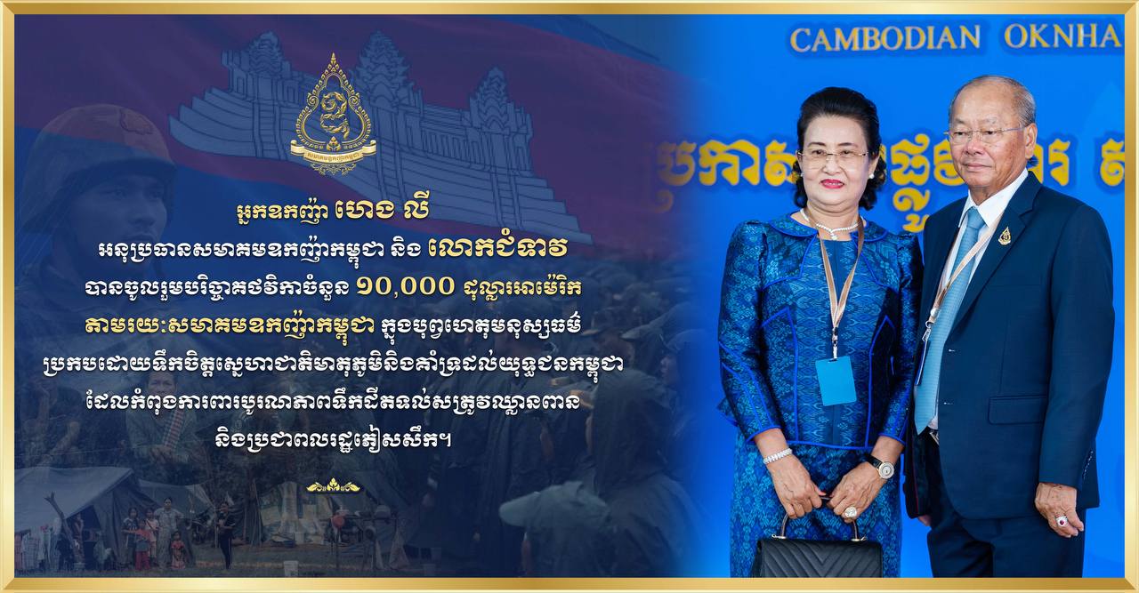 អ្នកឧកញ៉ា ហេង លី អនុប្រធានសមាគមឧកញ៉ាកម្ពុជា និងលោកជំទាវ បានចូលរួមបរិច្ចាគថវិកាចំនួន ១០,០០០ ដុល្លារអាម៉េរិក តាមរយៈសមាគមឧកញ៉ាកម្ពុជា ក្នុងបុព្វហេតុមនុស្សធម៌ ប្រកបដោយទឹកចិត្តស្នេហាជាតិមាតុភូមិ និងគាំទ្រដល់យុទ្ធជនកម្ពុជា ដែលកំពុងការពារបូរណភាពទឹកដីតទល់សត្រូវឈ្លានពាន និងប្រជាពលរដ្ឋភៀសសឹក។
