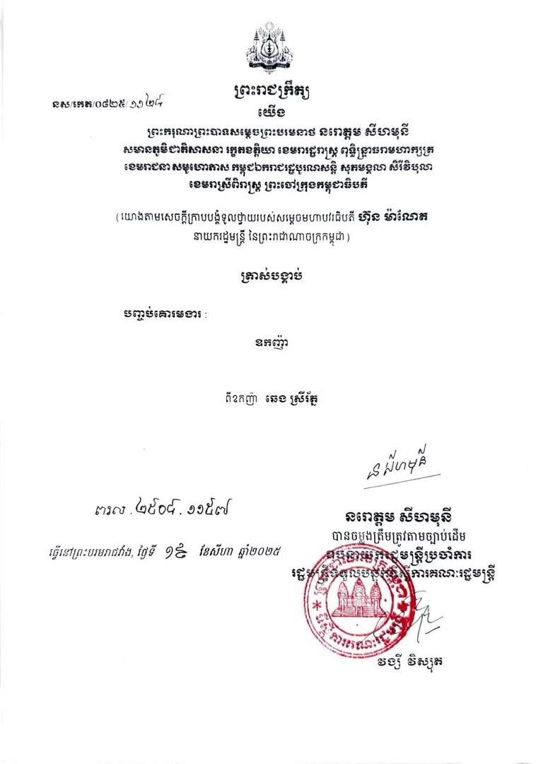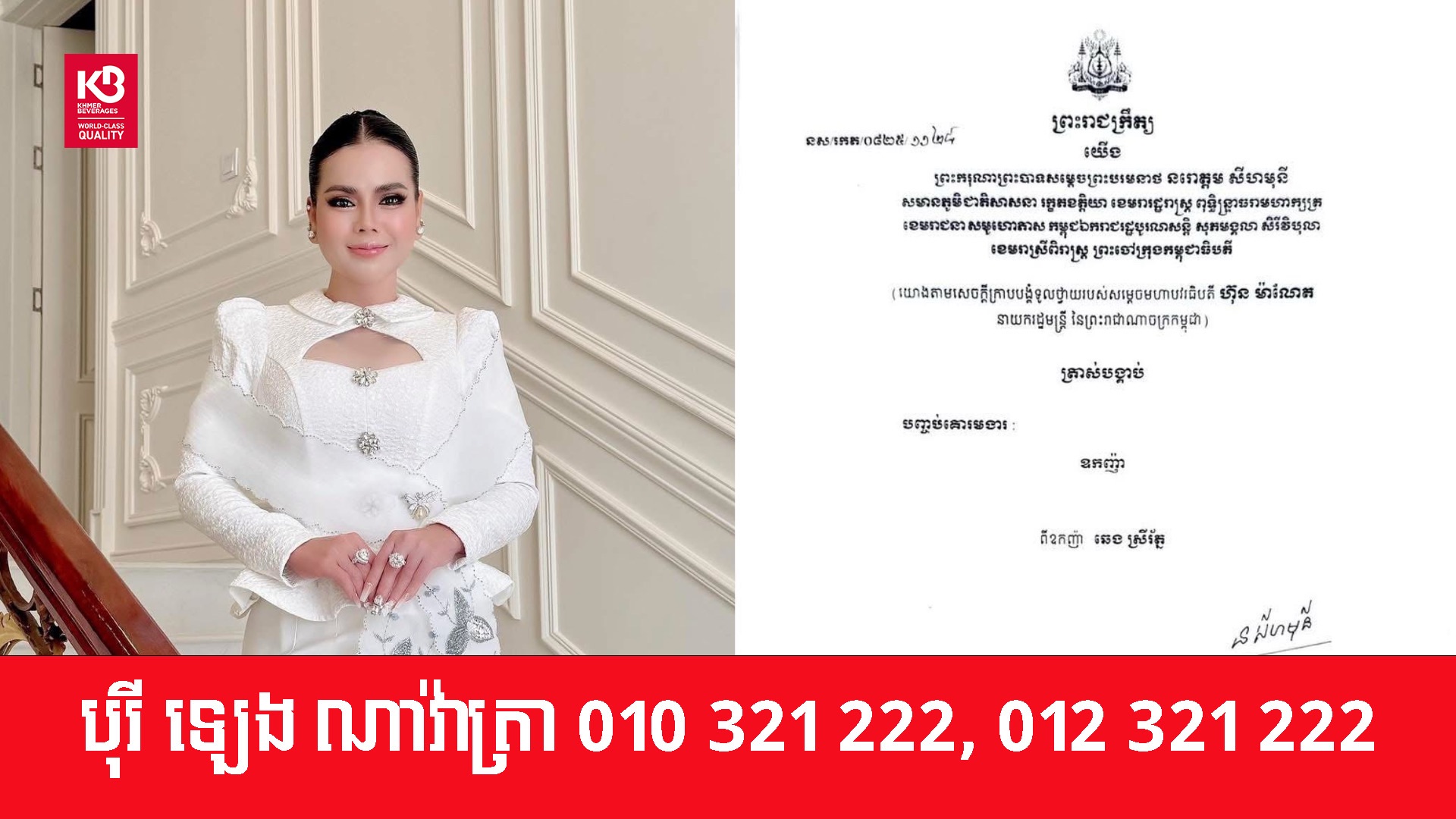 ព្រះមហាក្សត្រ ចេញព្រះរាជក្រឹត្យបញ្ចប់គោរមងារ «ឧកញ៉ា» ពីឧកញ៉ា ឆេង ស្រីរ័ត្ន ហៅ Love Riya