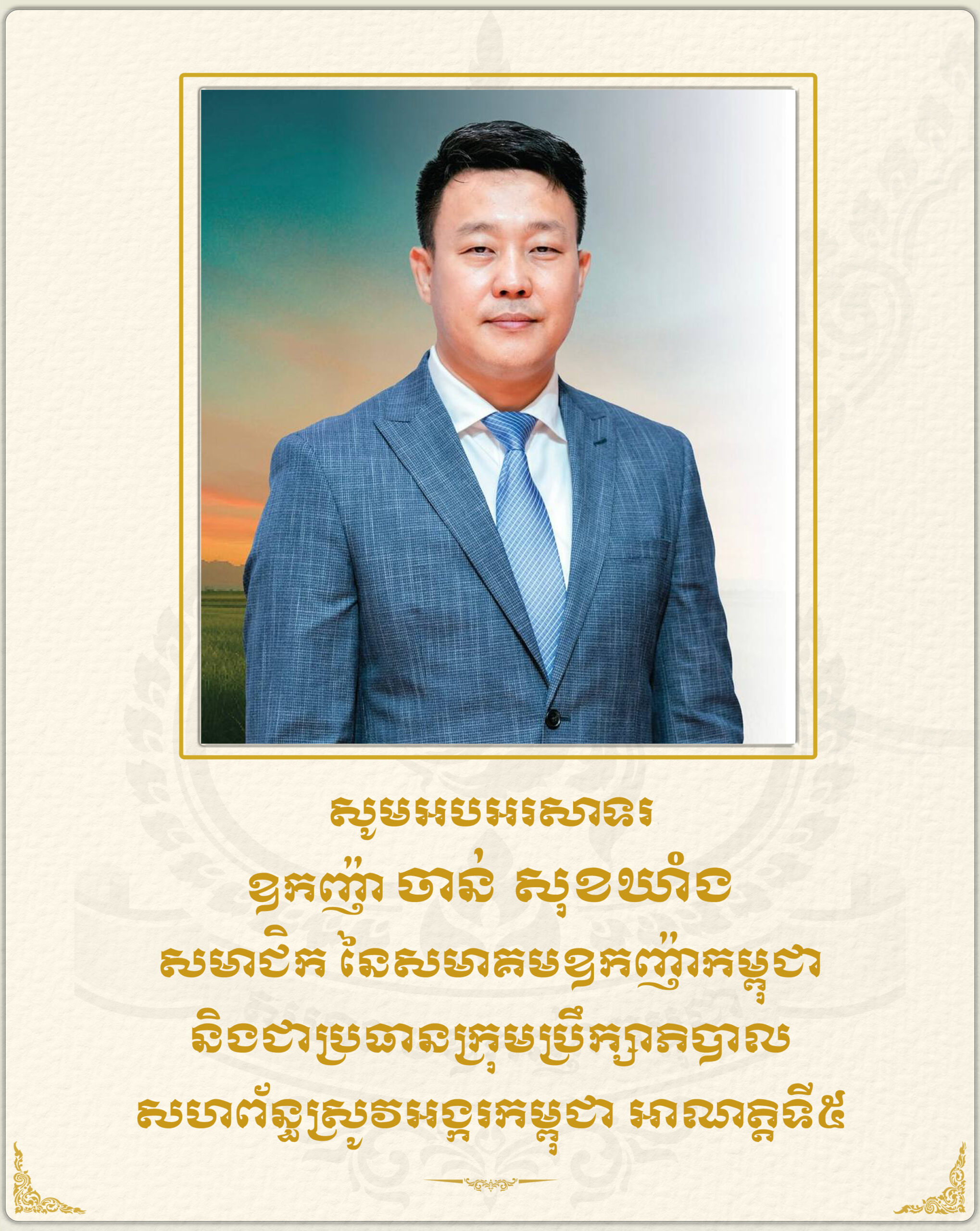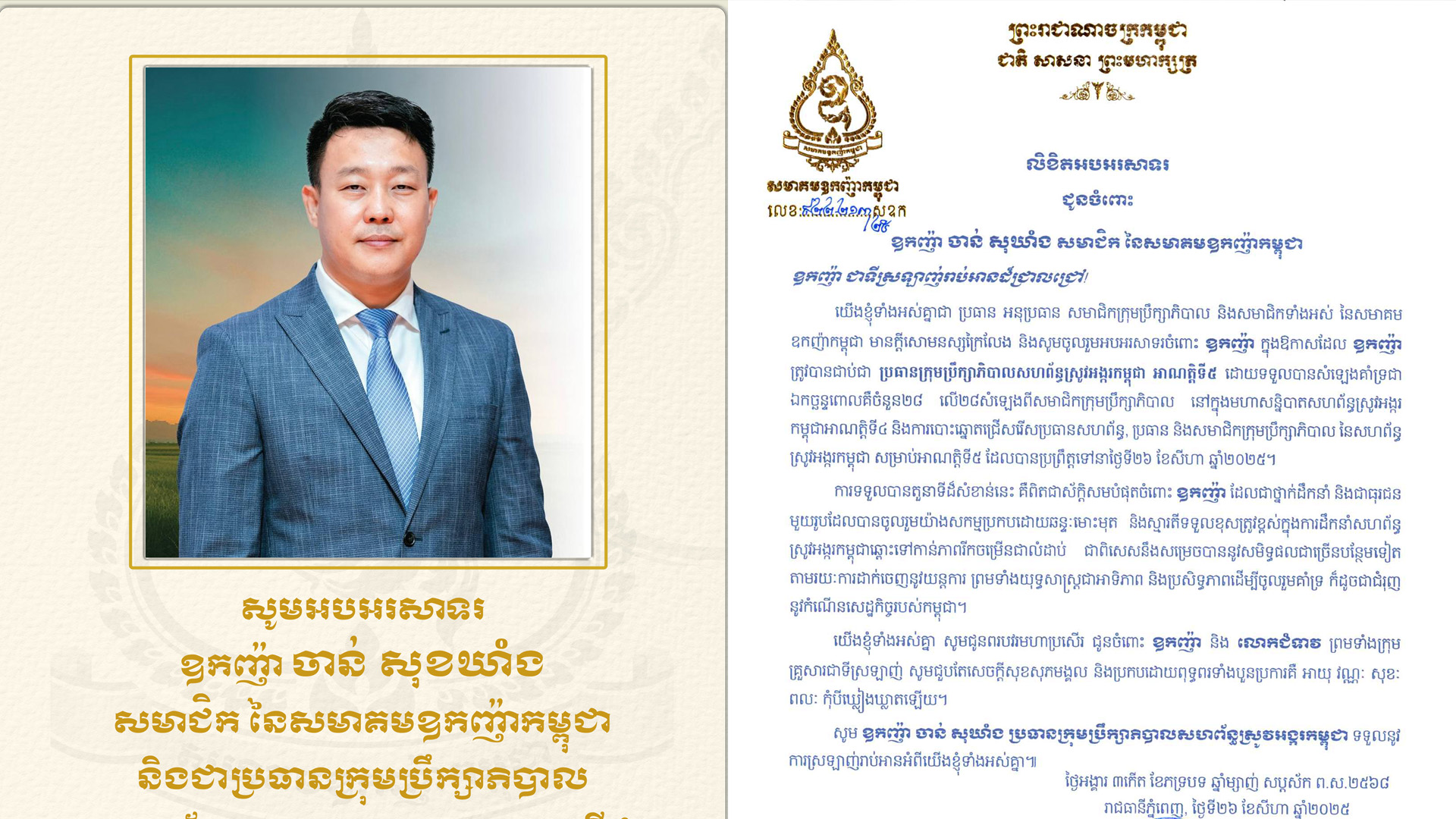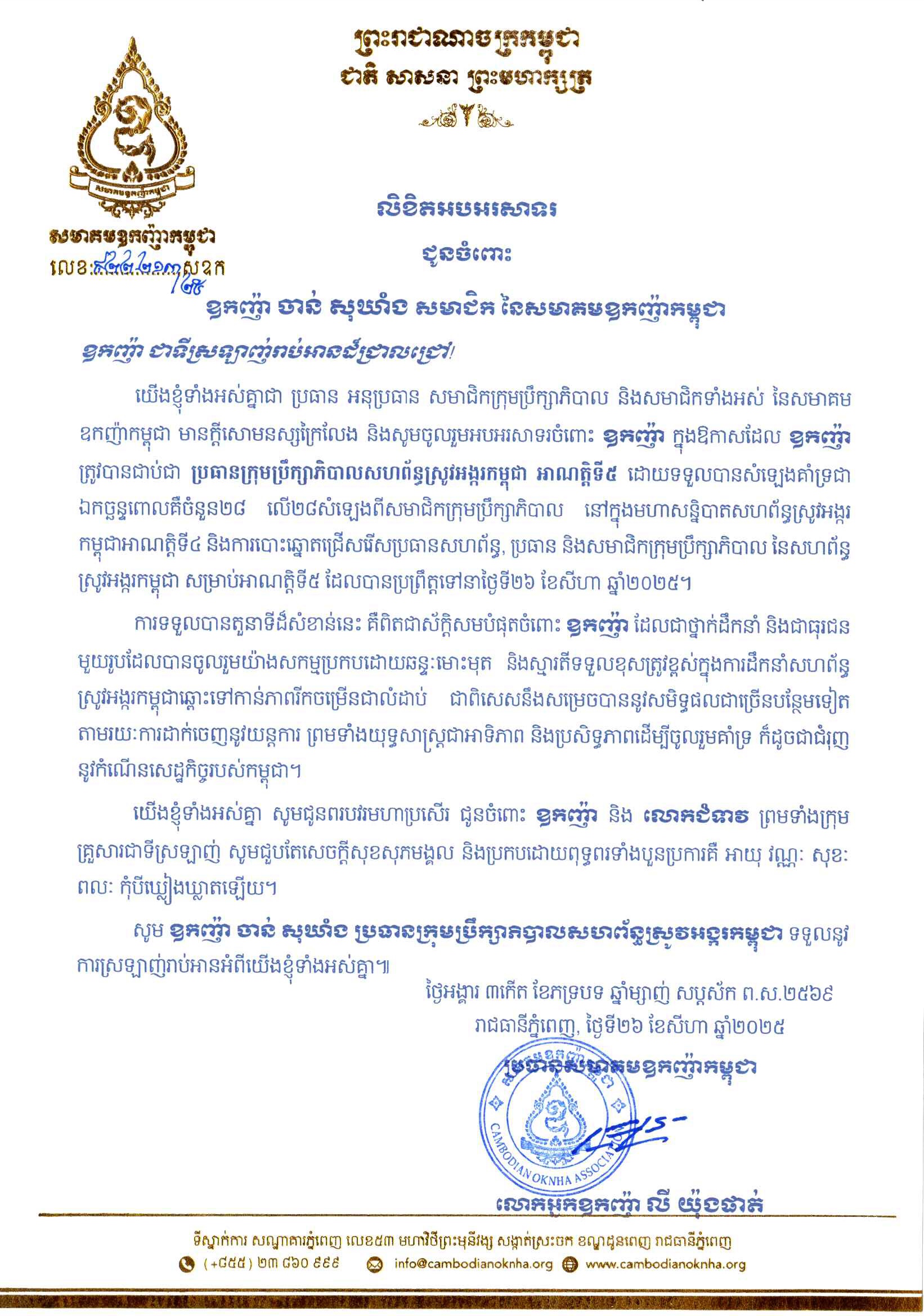 លិខិតអបអរសាទរពី លោកអ្នកឧកញ៉ា លី យ៉ុងផាត់ ប្រធានសមាគមឧកញ៉ាកម្ពុជា ជូនចំពោះ ឧកញ៉ា ចាន់ សុឃាំង សមាជិក នៃសមាគមឧកញ៉ាកម្ពុជា ក្នុងឱកាសដែល ឧកញ៉ា ត្រូវបានជាប់ជា «ប្រធានក្រុមប្រឹក្សាភិបាលសហព័ន្ធស្រូវអង្ករកម្ពុជា អាណត្តិទី៥» ដោយទទួលបានសំឡេងគាំទ្រជាឯកច្ឆន្ទពោលគឺចំនួន ២៨ លើ ២៨សំឡេង ពីសមាជិកក្រុមប្រឹក្សាភិបាលនៅក្នុងមហាសន្និបាតសហព័ន្ធស្រូវអង្ករកម្ពុជា អាណត្តិទី៤ និងការបោះឆ្នោតជ្រើសរើសប្រធានសហព័ន្ធ, ប្រធាន និងសមាជិកក្រុមប្រឹក្សាភិបាល នៃសហព័ន្ធស្រូវអង្ករកម្ពុជា សម្រាប់អាណត្តិទី៥ ដែលបានប្រព្រឹត្តទៅនាថ្ងៃទី២៦ ខែសីហា ឆ្នាំ២០២៥។