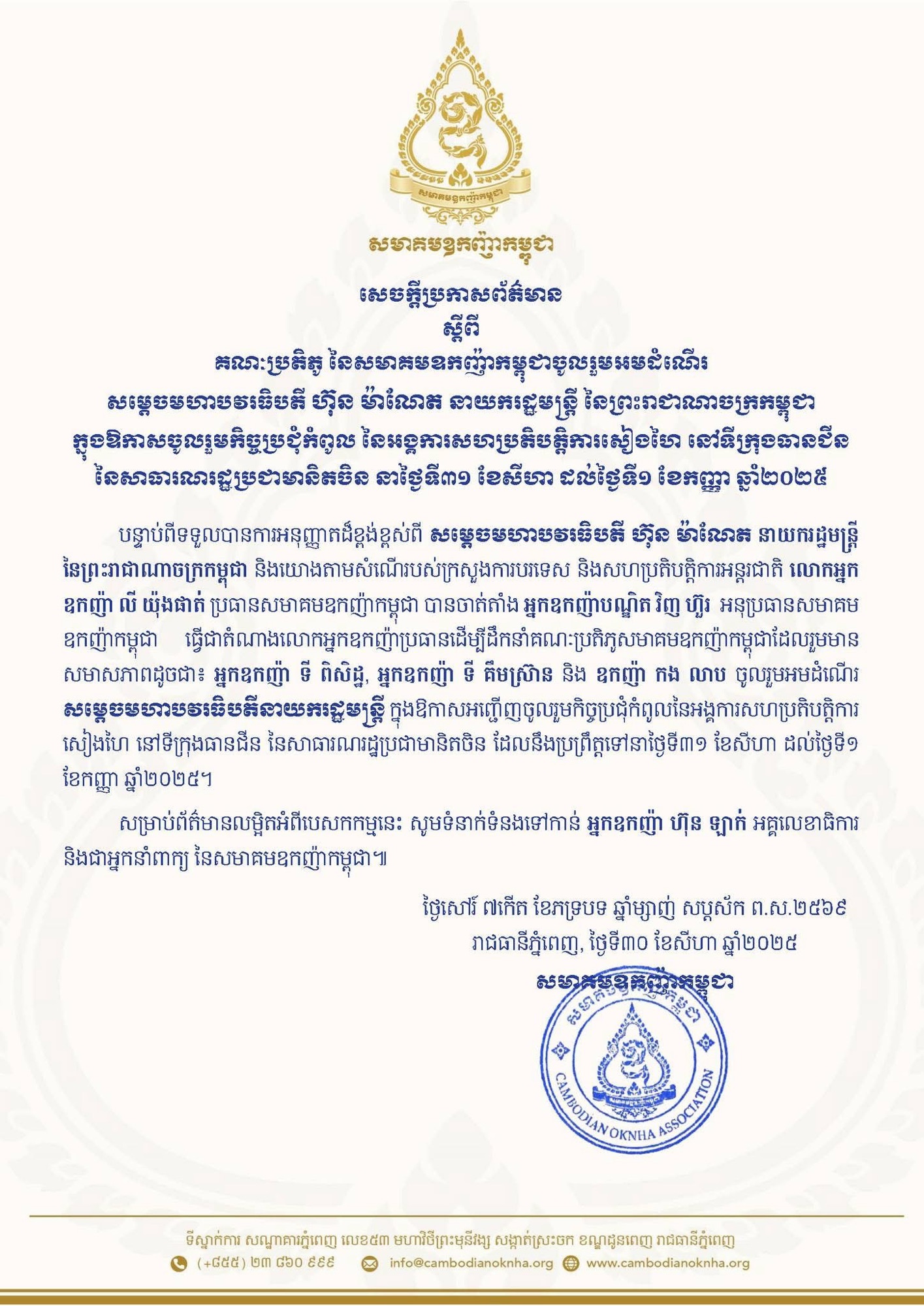 អ្នកឧកញ៉ា វិញ ហួរ អនុប្រធានសមាគមឧកញ៉ាកម្ពុជា តំណាងលោកអ្នកឧកញ៉ា លី យ៉ុងផាត់ ប្រធានសមាគម បានអញ្ជើញដឹកនាំគណៈប្រតិភូ នៃសមាគមឧកញ៉ាកម្ពុជា ចូលរួមអមដំណើរ សម្តេចមហាបវរធិបតី ហ៊ុន ម៉ាណែត នាយករដ្ឋមន្ត្រី នៃព្រះរាជាណាចក្រកម្ពុជា ក្នុងឱកាសចូលរួមកិច្ចប្រជុំកំពូល នៃអង្គការសហប្រតិបត្តិការសៀងហៃ នៅទីក្រុងធានជីន នៃសាធារណរដ្ឋប្រជាមានិតចិន នាថ្ងៃទី៣១ ខែសីហា ដល់ថ្ងៃទី១ ខែកញ្ញា ឆ្នាំ២០២៥។