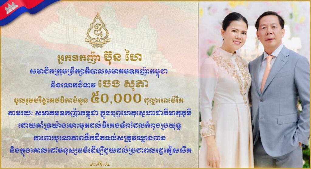 អ្នកឧកញ៉ា ប៊ុន ហៃ សមាជិកក្រុមប្រឹក្សាភិបាល នៃសមាគមឧកញ៉ាកម្ពុជា និងលោកជំទាវ ចេង សុភា បានចូលរួមបរិច្ចាគថវិកាចំនួន ៥០,០០០ ដុល្លារអាម៉េរិក តាមរយៈសមាគមឧកញ៉ាកម្ពុជា ក្នុងបុព្វហេតុសេ្នហាជាតិមាតុភូមិដោយគាំទ្រយ៉ាងមោះមុតដល់វីរកងទ័ពដែលកំពុងប្រយុទ្ធការពារបូរណភាពទឹកដីតទល់សត្រូវឈ្លានពាន និងក្នុងគោលដៅមនុស្សធម៌ ដើម្បីជួយដល់ប្រជាពលរដ្ឋភៀសសឹកពីតំបន់ជម្លោះ។