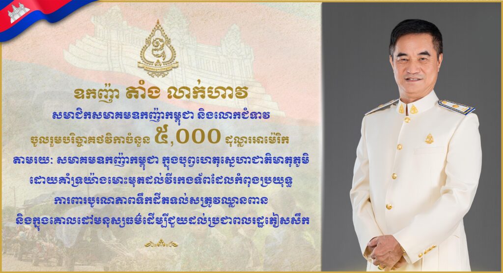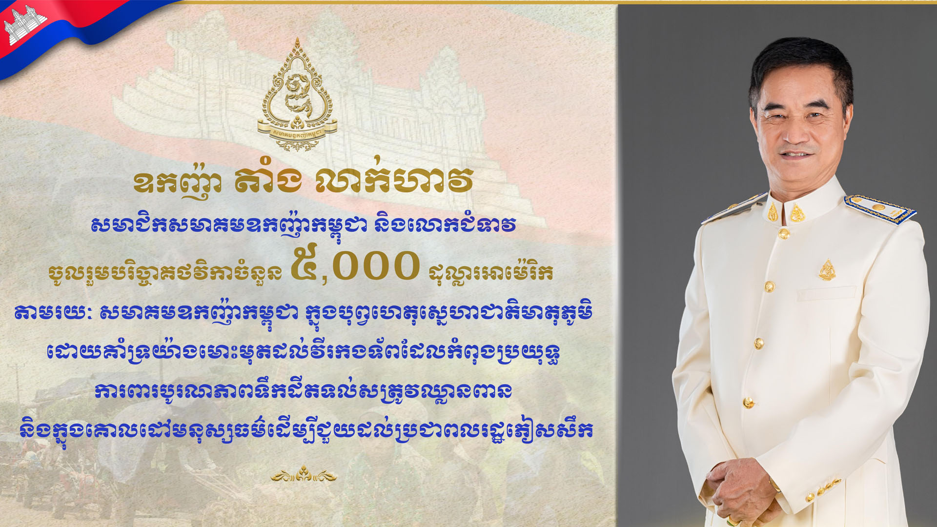 ឧកញ៉ា តាំង លាក់ហាវ សមាជិកសមាគមឧកញ៉ាកម្ពុជា និងលោកជំទាវ បានចូលរួមបរិច្ចាគថវិកាចំនួន ៥,០០០ ដុល្លារអាម៉េរិក តាមរយៈសមាគមឧកញ៉ាកម្ពុជា ក្នុងបុព្វហេតុសេ្នហាជាតិមាតុភូមិដោយគាំទ្រយ៉ាងមោះមុតដល់វីរកងទ័ពដែលកំពុងប្រយុទ្ធការពារបូរណភាពទឹកដីតទល់សត្រូវឈ្លានពាន និងក្នុងគោលដៅមនុស្សធម៌ដើម្បីជួយដល់ប្រជាពលរដ្ឋភៀសសឹកពីតំបន់ជម្លោះ៕