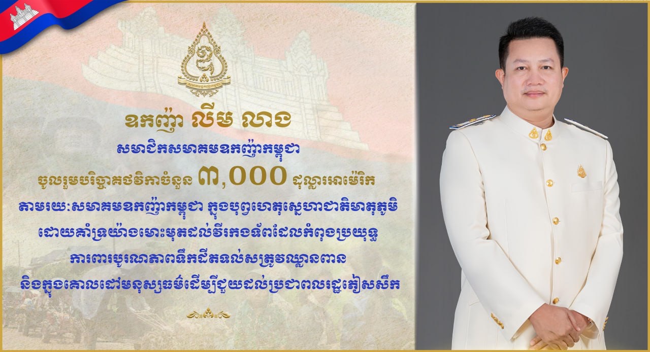ឧកញ៉ា លីម លាង សមាជិកសមាគមឧកញ៉ាកម្ពុជា បានចូលរួមបរិច្ចាគថវិកាចំនួន ៣,០០០ ដុល្លារអាម៉េរិក តាមរយៈសមាគមឧកញ៉ាកម្ពុជា ក្នុងបុព្វហេតុសេ្នហាជាតិមាតុភូមិដោយគាំទ្រយ៉ាងមោះមុតដល់វីរកងទ័ពដែលកំពុងប្រយុទ្ធការពារបូរណភាពទឹកដីតទល់សត្រូវឈ្លានពាន និងក្នុងគោលដៅមនុស្សធម៌ដើម្បីជួយដល់ប្រជាពលរដ្ឋភៀសសឹកពីតំបន់ជម្លោះ។