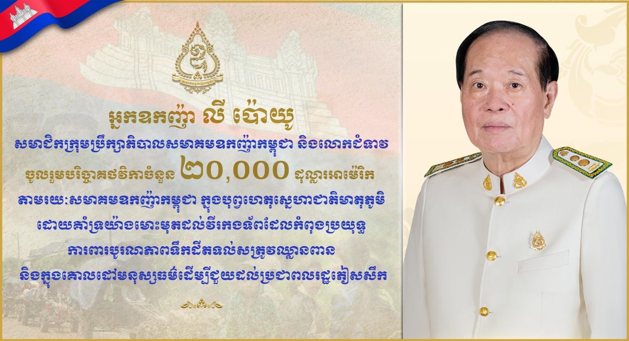អ្នកឧកញ៉ា លី ប៉ោយូ សមាជិកក្រុមប្រឹក្សាភិបាល នៃសមាគមឧកញ៉ាកម្ពុជា និងលោកជំទាវ បានចូលរួមបរិច្ចាគថវិកាចំនួន ២០,០០០ ដុល្លារអាម៉េរិក តាមរយៈសមាគមឧកញ៉ាកម្ពុជា ក្នុងបុព្វហេតុសេ្នហាជាតិមាតុភូមិដោយគាំទ្រយ៉ាងមោះមុតដល់វីរកងទ័ពដែលកំពុងប្រយុទ្ធការពារបូរណភាពទឹកដីតទល់សត្រូវឈ្លានពាន និងក្នុងគោលដៅមនុស្សធម៌ដើម្បីជួយដល់ប្រជាពលរដ្ឋភៀសសឹកពីតំបន់ជម្លោះ។