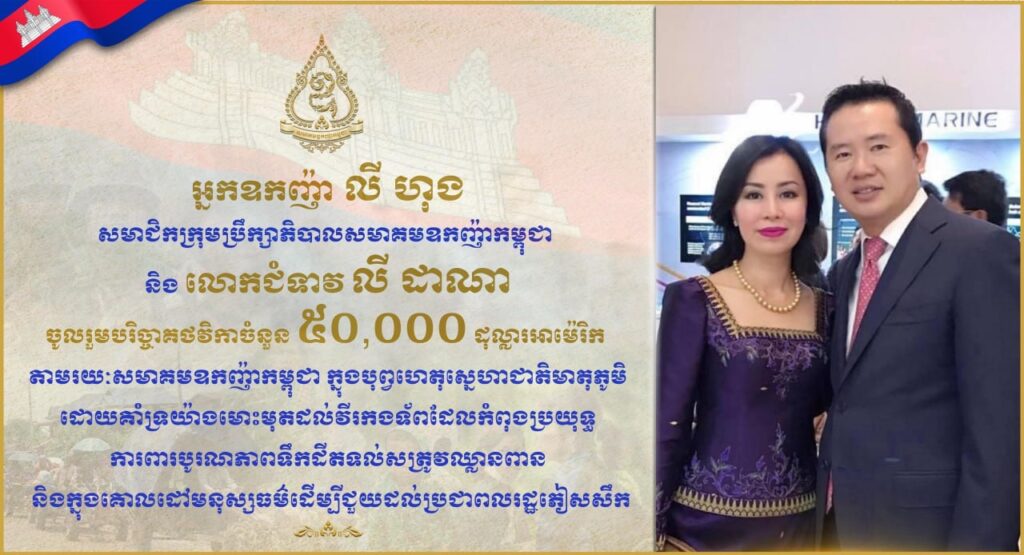 អ្នកឧកញ៉ា លី ហុង សមាជិកក្រុមប្រឹក្សាភិបាល នៃសមាគមឧកញ៉ាកម្ពុជា និងលោកជំទាវ លី ដាណា បានចូលរួមបរិច្ចាគថវិកាចំនួន ៥០,០០០ ដុល្លារអាម៉េរិក តាមរយៈសមាគមឧកញ៉ាកម្ពុជា ក្នុងបុព្វហេតុសេ្នហាជាតិមាតុភូមិដោយគាំទ្រយ៉ាងមោះមុតដល់វីរកងទ័ពដែលកំពុងប្រយុទ្ធការពារបូរណភាពទឹកដីតទល់សត្រូវឈ្លានពាន និងក្នុងគោលដៅមនុស្សធម៌ដើម្បីជួយដល់ប្រជាពលរដ្ឋភៀសសឹកពីតំបន់ជម្លោះ។