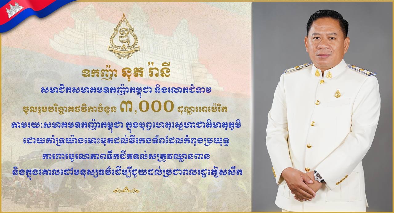 ឧកញ៉ា នុត រ៉ានី សមាជិកសមាគមឧកញ៉ាកម្ពុជា និងលោកជំទាវ បានចូលរួមបរិច្ចាគថវិកាចំនួន ៣,០០០ ដុល្លារអាម៉េរិក តាមរយៈសមាគមឧកញ៉ាកម្ពុជា ក្នុងបុព្វហេតុសេ្នហាជាតិមាតុភូមិដោយគាំទ្រយ៉ាងមោះមុតដល់វីរកងទ័ពដែលកំពុងប្រយុទ្ធការពារបូរណភាពទឹកដីតទល់សត្រូវឈ្លានពាន និងក្នុងគោលដៅមនុស្សធម៌ដើម្បីជួយដល់ប្រជាពលរដ្ឋភៀសសឹកពីតំបន់ជម្លោះ។