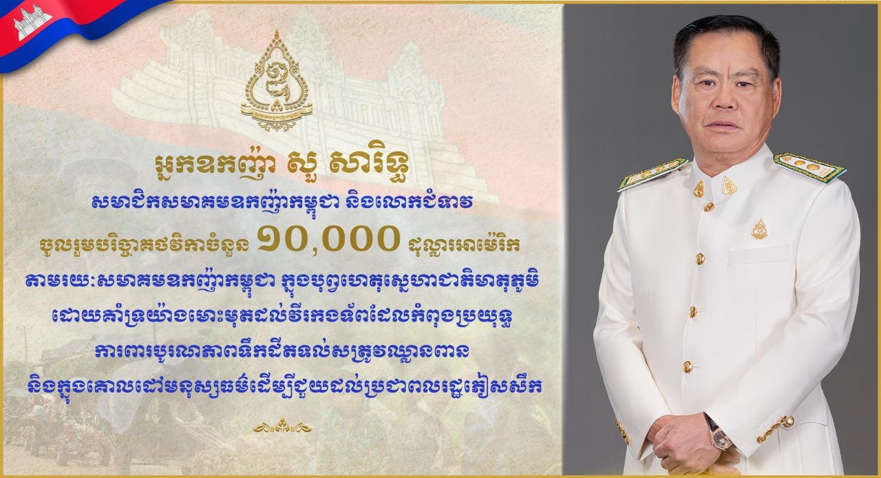 អ្នកឧកញ៉ា សួ សារិទ្ធ សមាជិកសមាគមឧកញ៉ាកម្ពុជា និងលោកជំទាវ បានចូលរួមបរិច្ចាគថវិកាចំនួន ១០,០០០ ដុល្លារអាម៉េរិក តាមរយៈសមាគមឧកញ៉ាកម្ពុជា ក្នុងបុព្វហេតុសេ្នហាជាតិមាតុភូមិដោយគាំទ្រយ៉ាងមោះមុតដល់វីរកងទ័ពដែលកំពុងប្រយុទ្ធការពារបូរណភាពទឹកដីតទល់សត្រូវឈ្លានពាន និងក្នុងគោលដៅមនុស្សធម៌ដើម្បីជួយដល់ប្រជាពលរដ្ឋភៀសសឹកពីតំបន់ជម្លោះ។