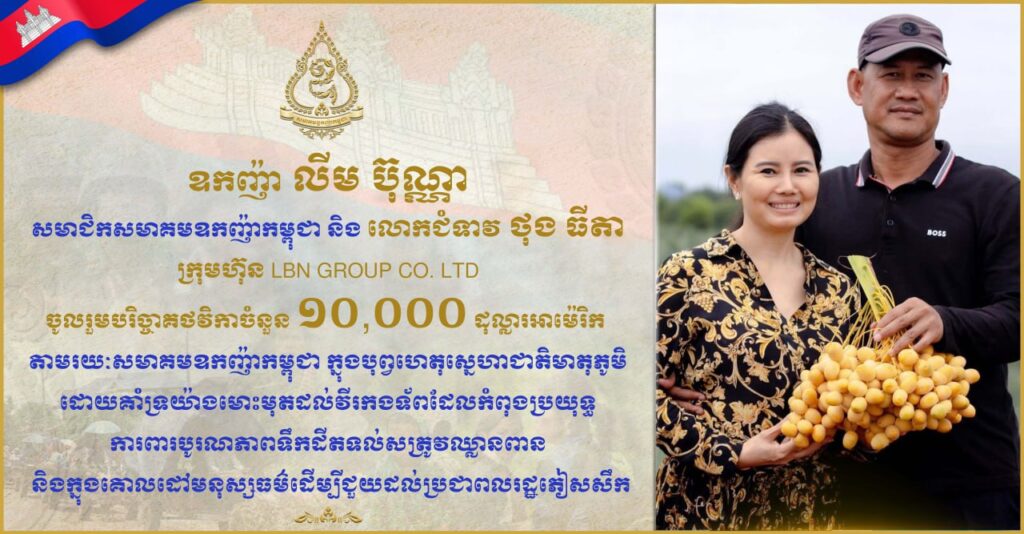 ឧកញ៉ា លីម ប៊ុណ្ណា សមាជិកសមាគមឧកញ៉ាកម្ពុជា និងលោកជំទាវ ថុង ធីតា (ក្រុមហ៊ុន LBN GROUP Co., LTD) បានចូលរួមបរិច្ចាគថវិកាចំនួន ១០,០០០ ដុល្លារអាម៉េរិក តាមរយៈសមាគមឧកញ៉ាកម្ពុជា ក្នុងបុព្វហេតុសេ្នហាជាតិមាតុភូមិដោយគាំទ្រយ៉ាងមោះមុតដល់វីរកងទ័ពដែលកំពុងប្រយុទ្ធការពារបូរណភាពទឹកដីតទល់សត្រូវឈ្លានពាន និងក្នុងគោលដៅមនុស្សធម៌ដើម្បីជួយដល់ប្រជាពលរដ្ឋភៀសសឹកពីតំបន់ជម្លោះ។