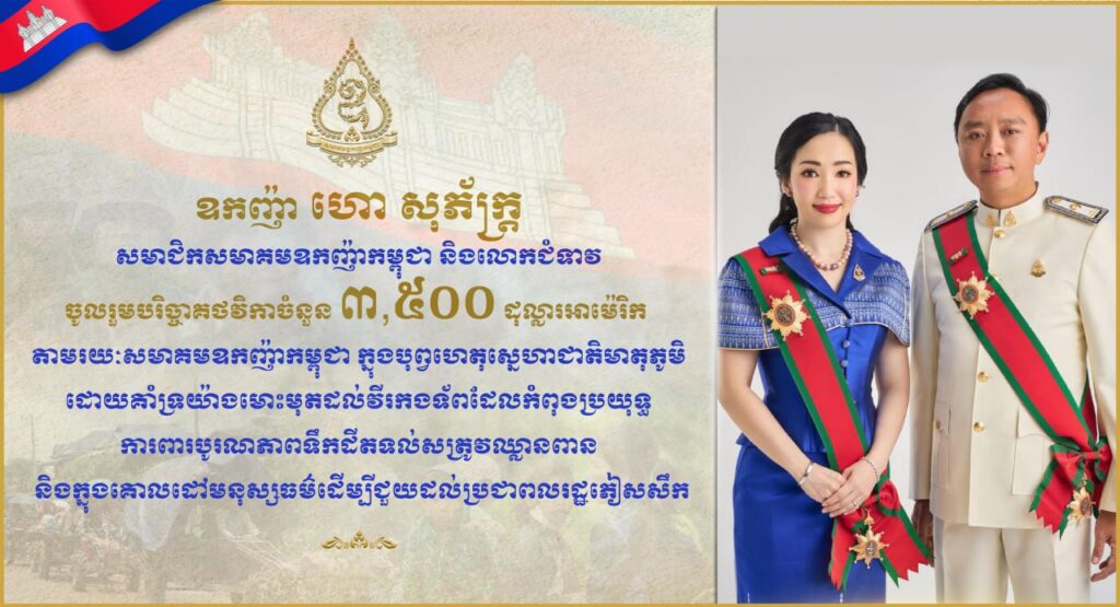 ឧកញ៉ា ហោ សុភ័ក្រ្ត សមាជិកសមាគមឧកញ៉ាកម្ពុជា និងលោកជំទាវ បានចូលរួមបរិច្ចាគថវិកាចំនួន ៣,៥០០ ដុល្លារអាម៉េរិក តាមរយៈសមាគមឧកញ៉ាកម្ពុជា ក្នុងបុព្វហេតុសេ្នហាជាតិមាតុភូមិដោយគាំទ្រយ៉ាងមោះមុតដល់វីរកងទ័ពដែលកំពុងប្រយុទ្ធការពារបូរណភាពទឹកដីតទល់សត្រូវឈ្លានពាន និងក្នុងគោលដៅមនុស្សធម៌ដើម្បីជួយដល់ប្រជាពលរដ្ឋភៀសសឹកពីតំបន់ជម្លោះ។