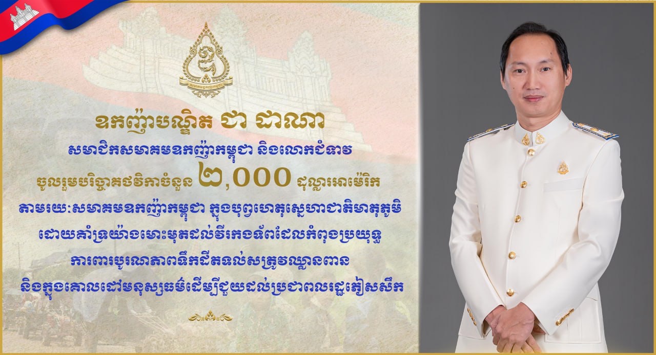 ឧកញ៉ាបណ្ឌិត ជា ដាណា សមាជិកសមាគមឧកញ៉ាកម្ពុជា និងលោកជំទាវ បានចូលរួមបរិច្ចាគថវិកាចំនួន ២,០០០ ដុល្លារអាម៉េរិក តាមរយៈសមាគមឧកញ៉ាកម្ពុជា ក្នុងបុព្វហេតុសេ្នហាជាតិមាតុភូមិដោយគាំទ្រយ៉ាងមោះមុតដល់វីរកងទ័ពដែលកំពុងប្រយុទ្ធការពារបូរណភាពទឹកដីតទល់សត្រូវឈ្លានពាន និងក្នុងគោលដៅមនុស្សធម៌ដើម្បីជួយដល់ប្រជាពលរដ្ឋភៀសសឹកពីតំបន់ជម្លោះ។