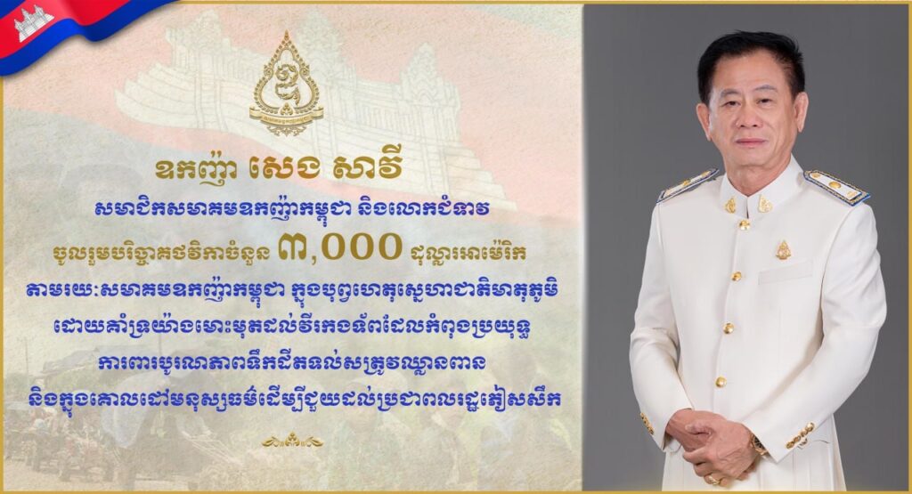 ឧកញ៉ា សេង សាវី សមាជិកសមាគមឧកញ៉ាកម្ពុជា និងលោកជំទាវ បានចូលរួមបរិច្ចាគថវិកាចំនួន ៣,០០០ ដុល្លារអាម៉េរិក តាមរយៈសមាគមឧកញ៉ាកម្ពុជា ក្នុងបុព្វហេតុសេ្នហាជាតិមាតុភូមិដោយគាំទ្រយ៉ាងមោះមុតដល់វីរកងទ័ពដែលកំពុងប្រយុទ្ធការពារបូរណភាពទឹកដីតទល់សត្រូវឈ្លានពាន និងក្នុងគោលដៅមនុស្សធម៌ដើម្បីជួយដល់ប្រជាពលរដ្ឋភៀសសឹកពីតំបន់ជម្លោះ។