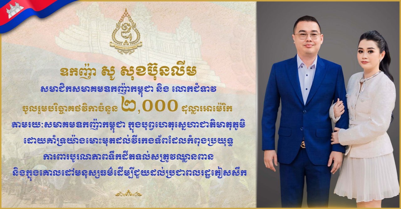 ឧកញ៉ា សូ សុខប៊ុនលីម សមាជិកសមាគមឧកញ៉ាកម្ពុជា និងលោកជំទាវ បានចូលរួមបរិច្ចាគថវិកាចំនួន ២,០០០ ដុល្លារអាម៉េរិក តាមរយៈសមាគមឧកញ៉ាកម្ពុជា ក្នុងបុព្វហេតុសេ្នហាជាតិមាតុភូមិដោយគាំទ្រយ៉ាងមោះមុតដល់វីរកងទ័ពដែលកំពុងប្រយុទ្ធការពារបូរណភាពទឹកដីតទល់សត្រូវឈ្លានពាន និងក្នុងគោលដៅមនុស្សធម៌ដើម្បីជួយដល់ប្រជាពលរដ្ឋភៀសសឹកពីតំបន់ជម្លោះ។