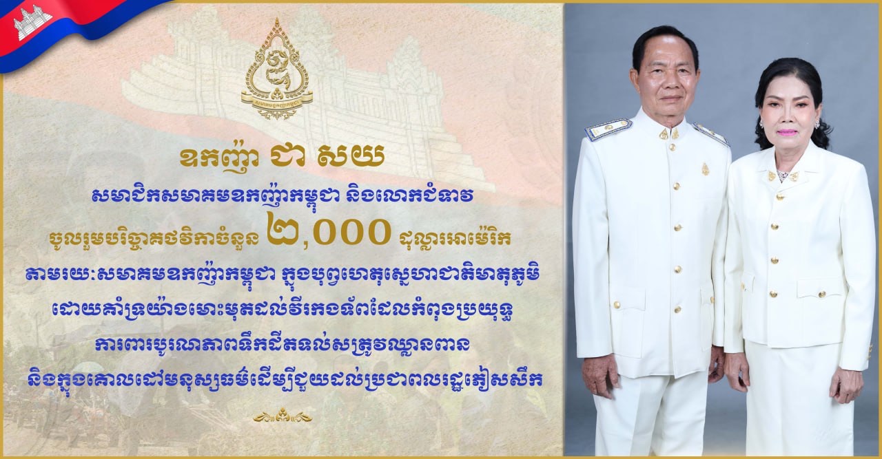 ឧកញ៉ា ជា សយ សមាជិកសមាគមឧកញ៉ាកម្ពុជា និងលោកជំទាវ បានចូលរួមបរិច្ចាគថវិកាចំនួន ២,០០០ ដុល្លារអាម៉េរិក តាមរយៈសមាគមឧកញ៉ាកម្ពុជា ក្នុងបុព្វហេតុសេ្នហាជាតិមាតុភូមិដោយគាំទ្រយ៉ាងមោះមុតដល់វីរកងទ័ពដែលកំពុងប្រយុទ្ធការពារបូរណភាពទឹកដីតទល់សត្រូវឈ្លានពាន និងក្នុងគោលដៅមនុស្សធម៌ដើម្បីជួយដល់ប្រជាពលរដ្ឋភៀសសឹកពីតំបន់ជម្លោះ។