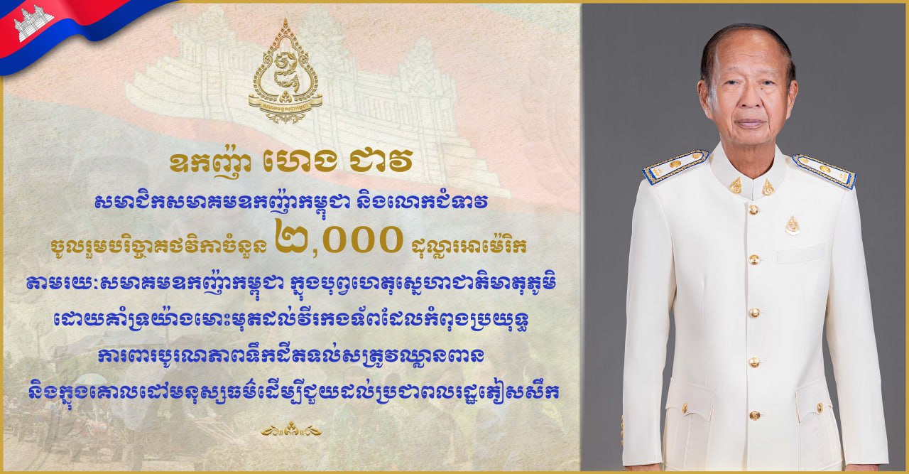 ឧកញ៉ា ហេង ជាវ សមាជិកសមាគមឧកញ៉ាកម្ពុជា និងលោកជំទាវ បានចូលរួមបរិច្ចាគថវិកាចំនួន ២,០០០ ដុល្លារអាម៉េរិក តាមរយៈសមាគមឧកញ៉ាកម្ពុជា ក្នុងបុព្វហេតុសេ្នហាជាតិមាតុភូមិដោយគាំទ្រយ៉ាងមោះមុតដល់វីរកងទ័ពដែលកំពុងប្រយុទ្ធការពារបូរណភាពទឹកដីតទល់សត្រូវឈ្លានពាន និងក្នុងគោលដៅមនុស្សធម៌ដើម្បីជួយដល់ប្រជាពលរដ្ឋភៀសសឹកពីតំបន់ជម្លោះ។