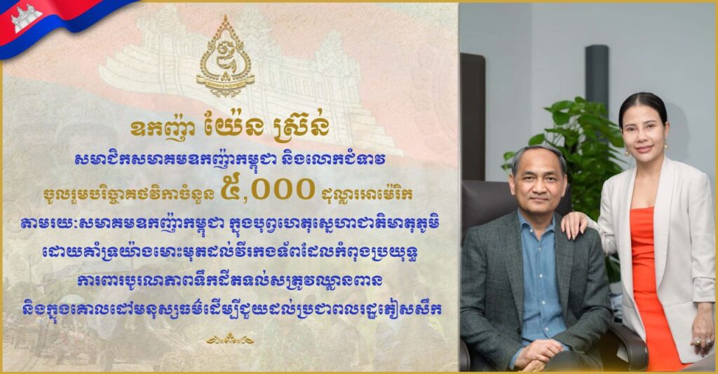 ឧកញ៉ា យ៉ែន ស្រ៊ន់ សមាជិកសមាគមឧកញ៉ាកម្ពុជា និងលោកជំទាវ បានចូលរួមបរិច្ចាគថវិកាចំនួន ៥,០០០ ដុល្លារអាម៉េរិក តាមរយៈសមាគមឧកញ៉ាកម្ពុជា ក្នុងបុព្វហេតុសេ្នហាជាតិមាតុភូមិដោយគាំទ្រយ៉ាងមោះមុតដល់វីរកងទ័ពដែលកំពុងប្រយុទ្ធការពារបូរណភាពទឹកដីតទល់សត្រូវឈ្លានពាន និងក្នុងគោលដៅមនុស្សធម៌ដើម្បីជួយដល់ប្រជាពលរដ្ឋភៀសសឹកពីតំបន់ជម្លោះ។
