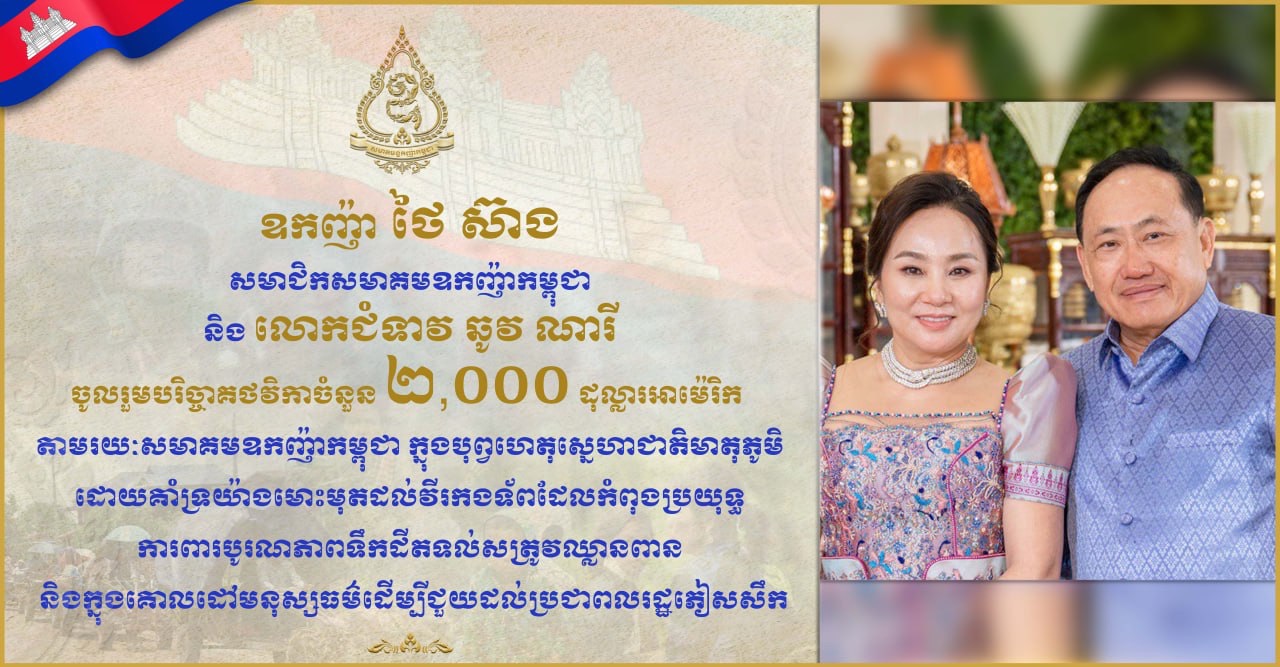 ឧកញ៉ា ថៃ ស៊ាង សមាជិកសមាគមឧកញ៉ាកម្ពុជា និងលោកជំទាវ ឆូវ ណារី បានចូលរួមបរិច្ចាគថវិកាចំនួន ២,០០០ ដុល្លាអាម៉េរិក តាមរយៈសមាគមឧកញ៉ាកម្ពុជា ក្នុងបុព្វហេតុសេ្នហាជាតិមាតុភូមិដោយគាំទ្រយ៉ាងមោះមុតដល់វីរកងទ័ពដែលកំពុងប្រយុទ្ធការពារបូរណភាពទឹកដីតទល់សត្រូវឈ្លានពាន និងក្នុងគោលដៅមនុស្សធម៌ដើម្បីជួយដល់ប្រជាពលរដ្ឋភៀសសឹកពីតំបន់ជម្លោះ។