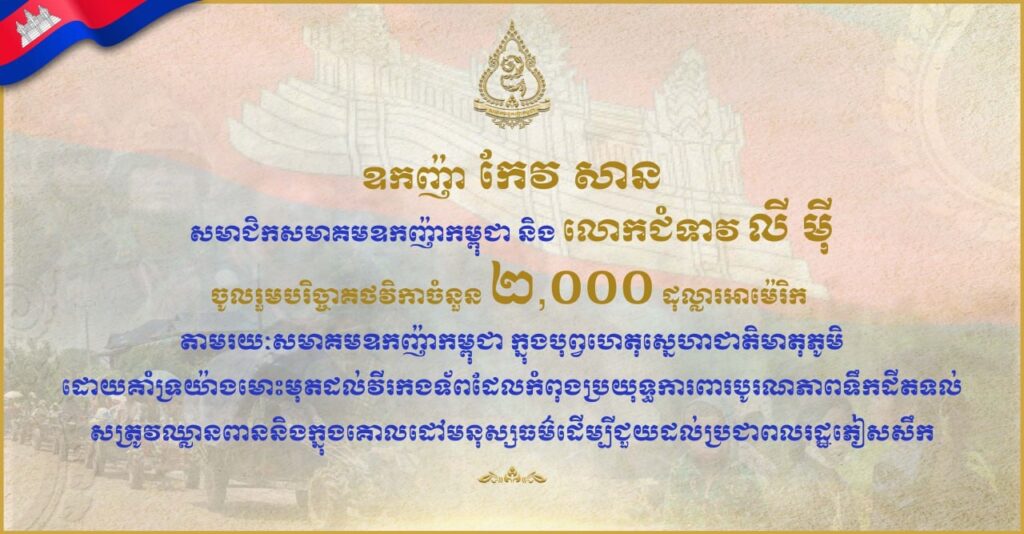 ឧកញ៉ា កែវ សាន និងលោកជំទាវ លី មុី ចូលរួមបរិច្ចាគថវិកា ២,០០០ដុល្លារ តាមរយៈសមាគមឧកញ៉ាកម្ពុជា គាំទ្រយ៉ាងមោះមុតដល់វីរកងទ័ពជួរមុខ