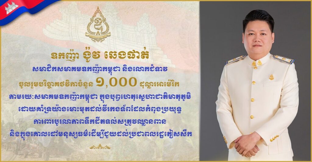 ឧកញ៉ា ង៉ូវ ឆេងផាត់ សមាជិកសមាគមឧកញ៉ាកម្ពុជា និងលោកជំទាវ បានចូលរួមបរិច្ចាគថវិកាចំនួន ១,០០០ ដុល្លារអាម៉េរិកតាមរយៈសមាគមឧកញ៉ាកម្ពុជា ក្នុងបុព្វហេតុសេ្នហាជាតិមាតុភូមិដោយគាំទ្រយ៉ាងមោះមុតដល់វីរកងទ័ពដែលកំពុងប្រយុទ្ធការពារបូរណភាពទឹកដីតទល់សត្រូវឈ្លានពាន និងក្នុងគោលដៅមនុស្សធម៌ដើម្បីជួយដល់ប្រជាពលរដ្ឋភៀសសឹកពីតំបន់ជម្លោះ។