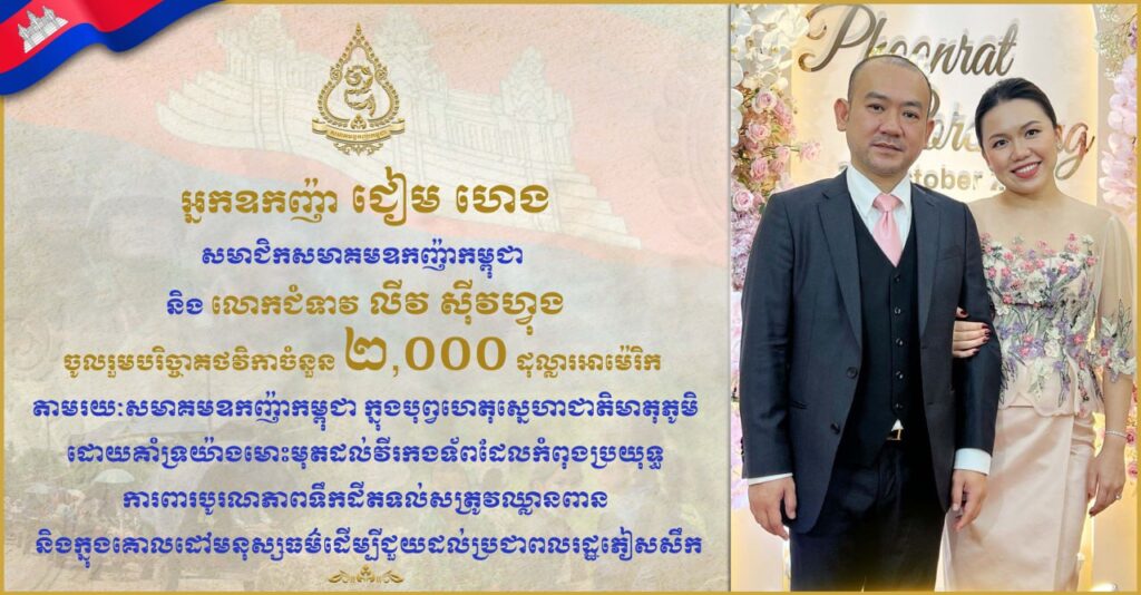 អ្នកឧកញ៉ា ជៀម ហេង និងឧកញ៉ា លីវ សុីវហ្វុង ចូលរួមបរិច្ចាគថវិកា ២,០០០ដុល្លារ តាមរយៈសមាគមឧកញ៉ាកម្ពុជា គាំទ្រយ៉ាងមោះមុតដល់វីរកងទ័ពជួរមុខ