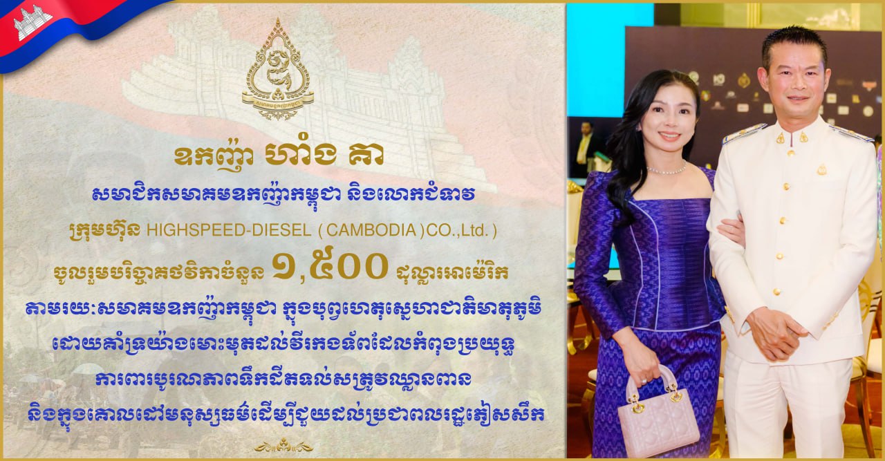 ឧកញ៉ា ហាំង គា សមាជិកសមាគមឧកញ៉ាកម្ពុជា និងលោកជំទាវ (ក្រុមហ៊ុន HIGHSPEED-DIESEL(CAMBODIA)CO., Ltd.) បានចូលរួមបរិច្ចាគថវិកាចំនួន ១,៥០០ ដុល្លារអាម៉េរិក តាមរយៈសមាគមឧកញ៉ាកម្ពុជា ក្នុងបុព្វហេតុសេ្នហាជាតិមាតុភូមិដោយគាំទ្រយ៉ាងមោះមុតដល់វីរកងទ័ពដែលកំពុងប្រយុទ្ធការពារបូរណភាពទឹកដីតទល់សត្រូវឈ្លានពាន និងក្នុងគោលដៅមនុស្សធម៌ដើម្បីជួយដល់ប្រជាពលរដ្ឋភៀសសឹកពីតំបន់ជម្លោះ។