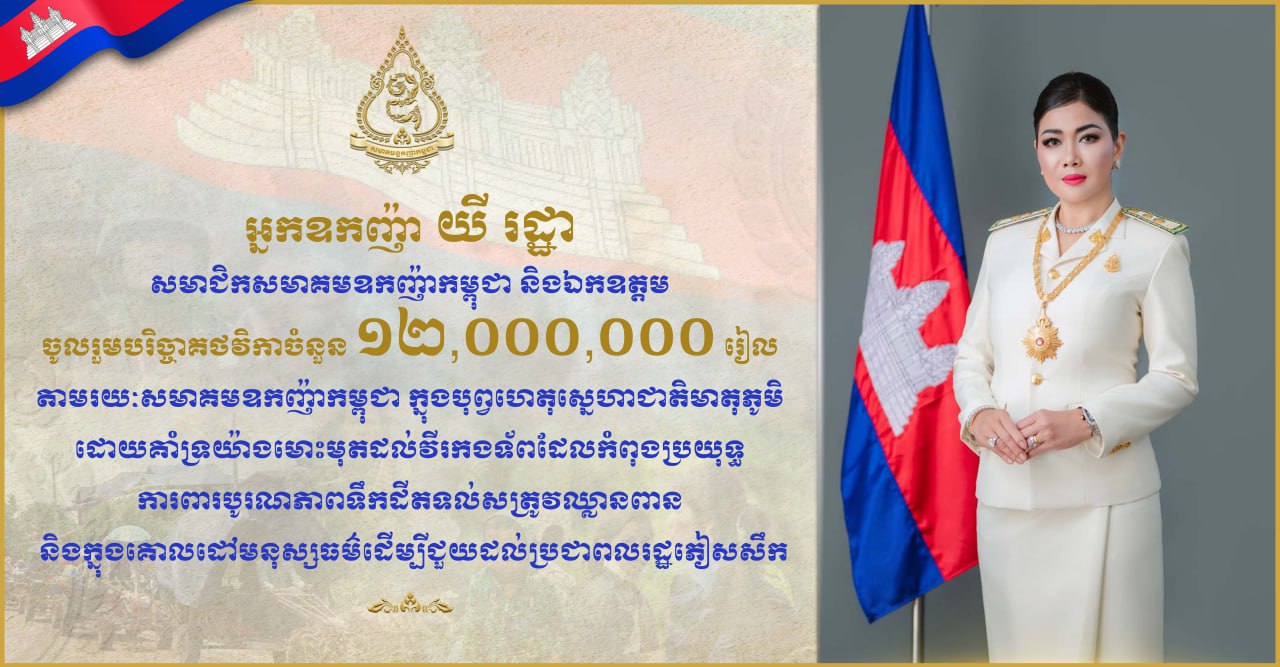 អ្នកឧកញ៉ា យី រដ្ឋា សមាជិកសមាគមឧកញ៉ាកម្ពុជា និងឯកឧត្តម (ក្រុមហ៊ុន YRT Group) បានចូលរួមបរិច្ចាគថវិកាចំនួន ១២លានរៀល តាមរយៈសមាគមឧកញ៉ាកម្ពុជា ក្នុងបុព្វហេតុសេ្នហាជាតិមាតុភូមិដោយគាំទ្រយ៉ាងមោះមុតដល់វីរកងទ័ពដែលកំពុងប្រយុទ្ធការពារបូរណភាពទឹកដីតទល់សត្រូវឈ្លានពាន និងក្នុងគោលដៅមនុស្សធម៌ដើម្បីជួយដល់ប្រជាពលរដ្ឋភៀសសឹកពីតំបន់ជម្លោះ។