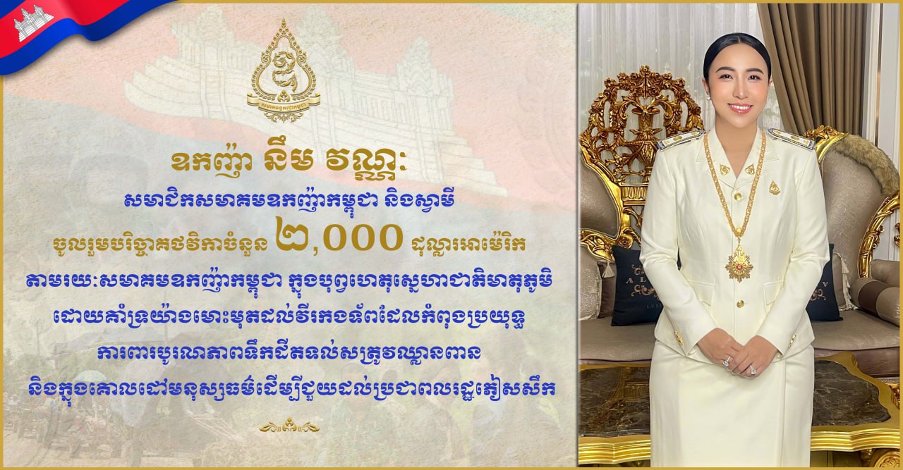 ឧកញ៉ា នឹម វណ្ណៈ សមាជិកសមាគមឧកញ៉ាកម្ពុជា និងស្វាមី បានចូលរួមបរិច្ចាគថវិកាចំនួន ២,០០០ ដុល្លារអាម៉េរិក តាមរយៈសមាគមឧកញ៉ាកម្ពុជា ក្នុងបុព្វហេតុសេ្នហាជាតិមាតុភូមិដោយគាំទ្រយ៉ាងមោះមុតដល់វីរកងទ័ពដែលកំពុងប្រយុទ្ធការពារបូរណភាពទឹកដីតទល់សត្រូវឈ្លានពាន និងក្នុងគោលដៅមនុស្សធម៌ដើម្បីជួយដល់ប្រជាពលរដ្ឋភៀសសឹកពីតំបន់ជម្លោះ។