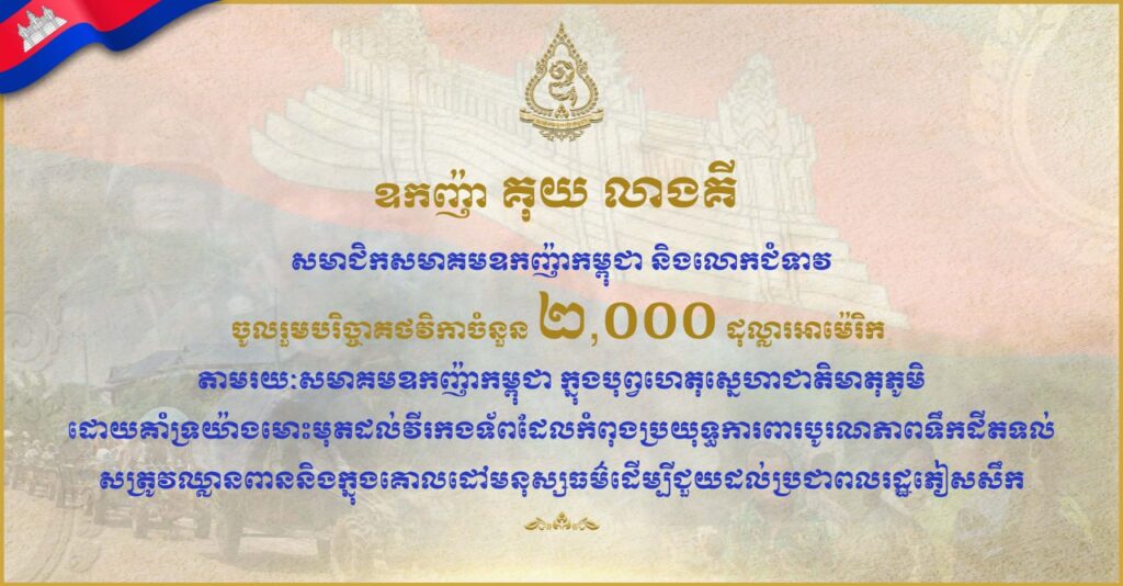 ឧកញ៉ា គុយ លាងគី និងលោកជំទាវ ចូលរួមបរិច្ចាគថវិកា ២,០០០ដុល្លារ តាមរយៈសមាគមឧកញ៉ាកម្ពុជា គាំទ្រយ៉ាងមោះមុតដល់វីរកងទ័ពជួរមុខ