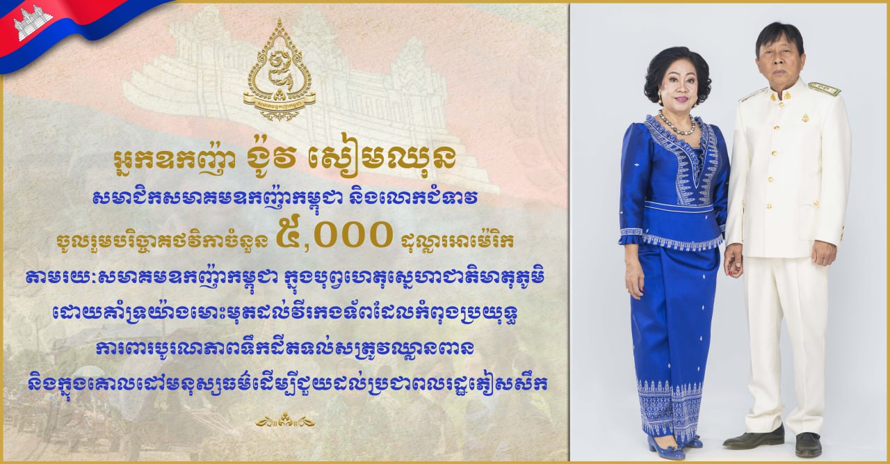អ្នកឧកញ៉ា ង៉ូវ សៀមឈុន សមាជិកសមាគមឧកញ៉ាកម្ពុជា និងលោកជំទាវ បានចូលរួមបរិច្ចាគថវិកាចំនួន ៥,០០០ ដុល្លារអាម៉េរិក តាមរយៈសមាគមឧកញ៉ាកម្ពុជា ក្នុងបុព្វហេតុសេ្នហាជាតិមាតុភូមិដោយគាំទ្រយ៉ាងមោះមុតដល់វីរកងទ័ពដែលកំពុងប្រយុទ្ធការពារបូរណភាពទឹកដីតទល់សត្រូវឈ្លានពាន និងក្នុងគោលដៅមនុស្សធម៌ដើម្បីជួយដល់ប្រជាពលរដ្ឋភៀសសឹកពីតំបន់ជម្លោះ។