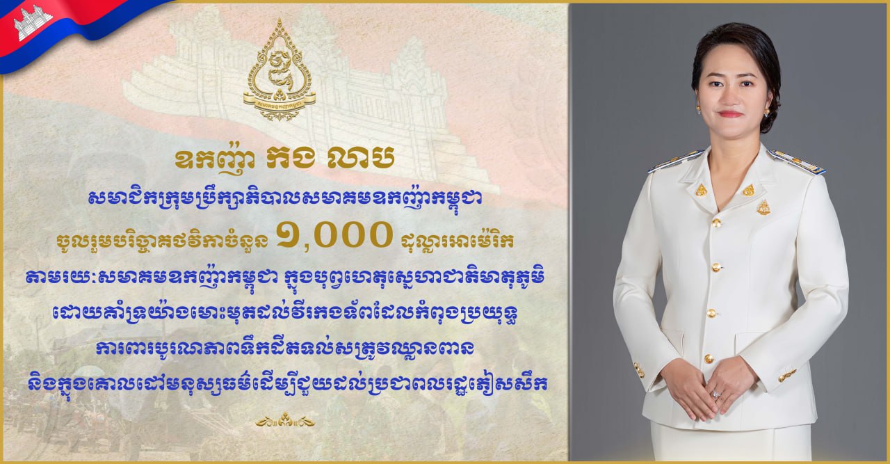 ឧកញ៉ា កង លាប សមាជិកក្រុមប្រឹក្សាភិបាល នៃសមាគមឧកញ៉ាកម្ពុជា បានចូលរួមបរិច្ចាគថវិកាចំនួន ១,០០០ ដុល្លារអាម៉េរិក តាមរយៈសមាគមឧកញ៉ាកម្ពុជា ក្នុងបុព្វហេតុសេ្នហាជាតិមាតុភូមិដោយគាំទ្រយ៉ាងមោះមុតដល់វីរកងទ័ពដែលកំពុងប្រយុទ្ធការពារបូរណភាពទឹកដីតទល់សត្រូវឈ្លានពាន និងក្នុងគោលដៅមនុស្សធម៌ដើម្បីជួយដល់ប្រជាពលរដ្ឋភៀសសឹកពីតំបន់ជម្លោះ។