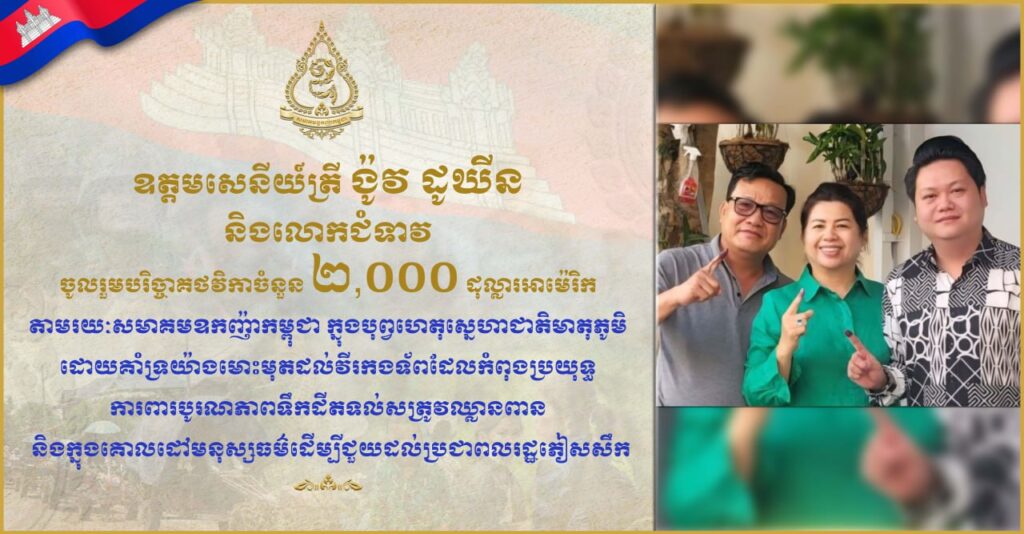 ឧត្តមសេនីយ៍ត្រី ង៉ូវ ដូឃីន និងលោកជំទាវ ចូលរួមបរិច្ចាគថវិកា ២,០០០ដុល្លារ តាមរយៈសមាគមឧកញ៉ាកម្ពុជា គាំទ្រយ៉ាងមោះមុតដល់វីរកងទ័ពជួរមុខ