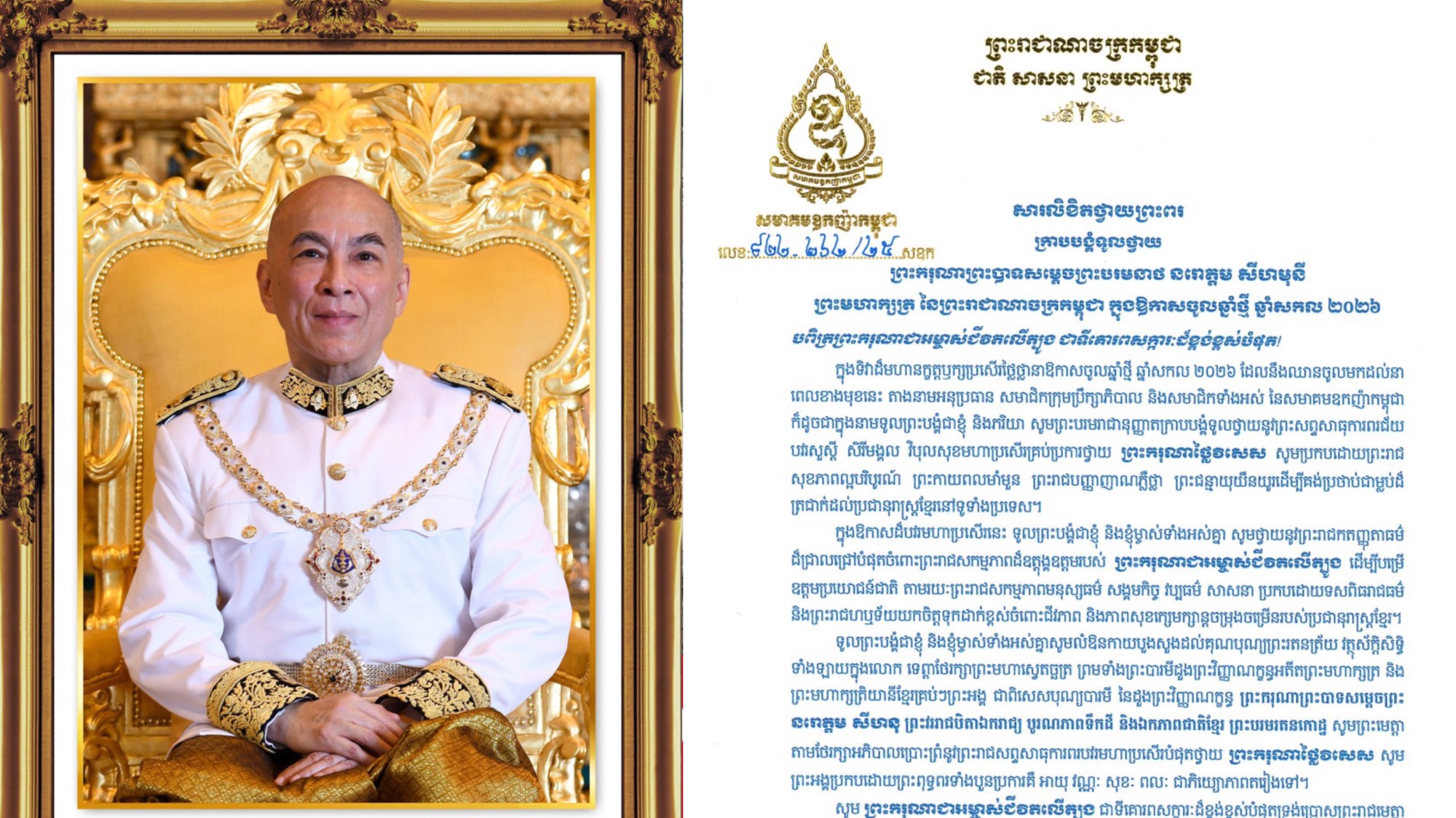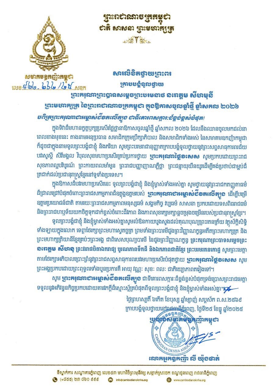 លោកអ្នកឧកញ៉ា លី យ៉ុងផាត់ ប្រធានសមាគមឧកញ៉ាកម្ពុជា ព្រមទាំង លោកអ្នកឧកញ៉ា អ្នកឧកញ៉ា ឧកញ៉ា ជាអនុប្រធាន សមាជិកក្រុមប្រឹក្សាភិបាល និងសមាជិកទាំងអស់ នៃសមាគមឧកញ៉ាកម្ពុជា សូមផ្ញើសារលិខិតថ្វាយព្រះពរក្រាបបង្គំទូលថ្វាយ ព្រះករុណាជាអម្ចាស់ជីវិតលើត្បូង ព្រះបាទសម្តេចព្រះបរមនាថ នរោត្តម សីហមុនី ព្រះមហាក្សត្រ នៃព្រះរាជាណាចក្រកម្ពុជា ជាទីគោរពសក្ការៈដ៏ខ្ពង់ខ្ពស់បំផុត ក្នុងឱកាសឆ្នាំថ្មី ឆ្នាំសកល ២០២៦។