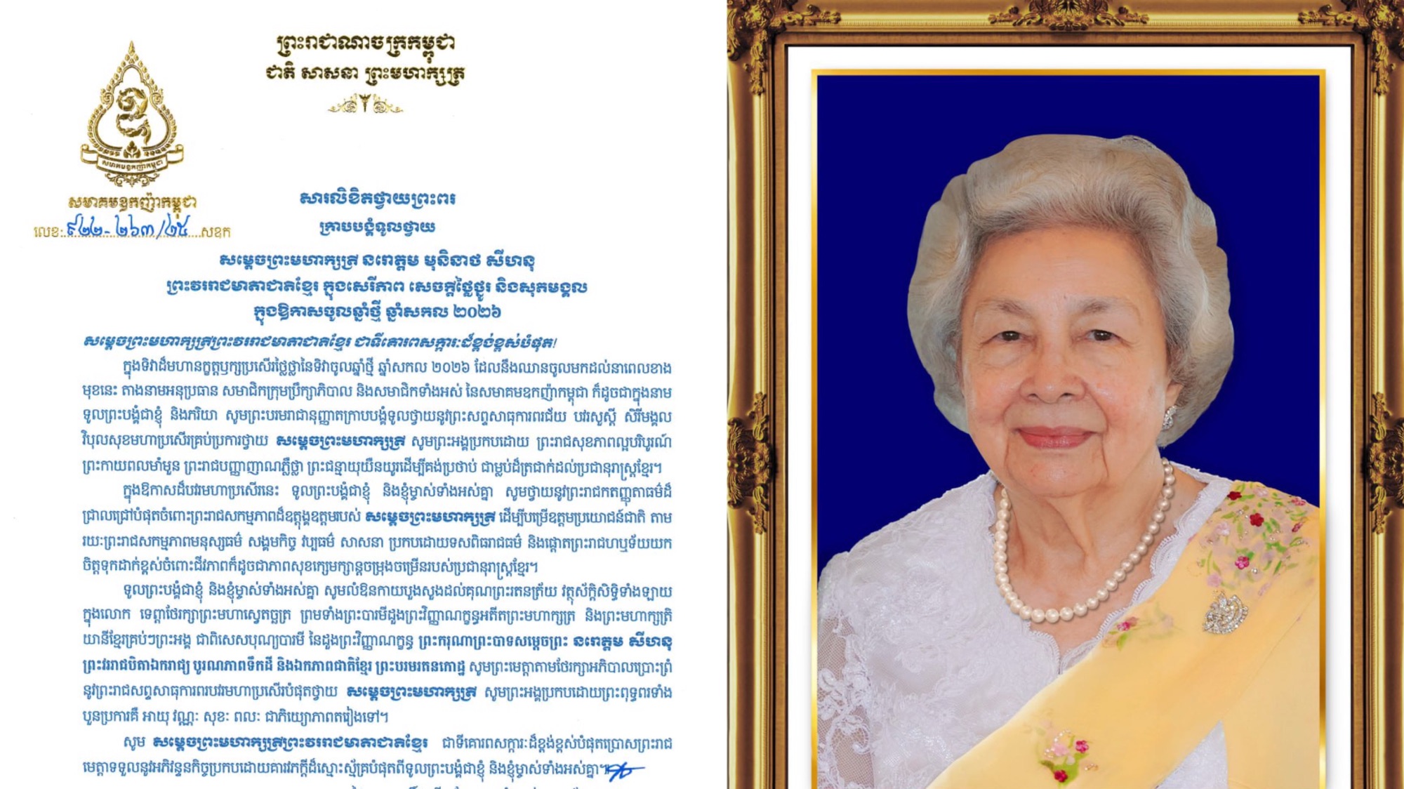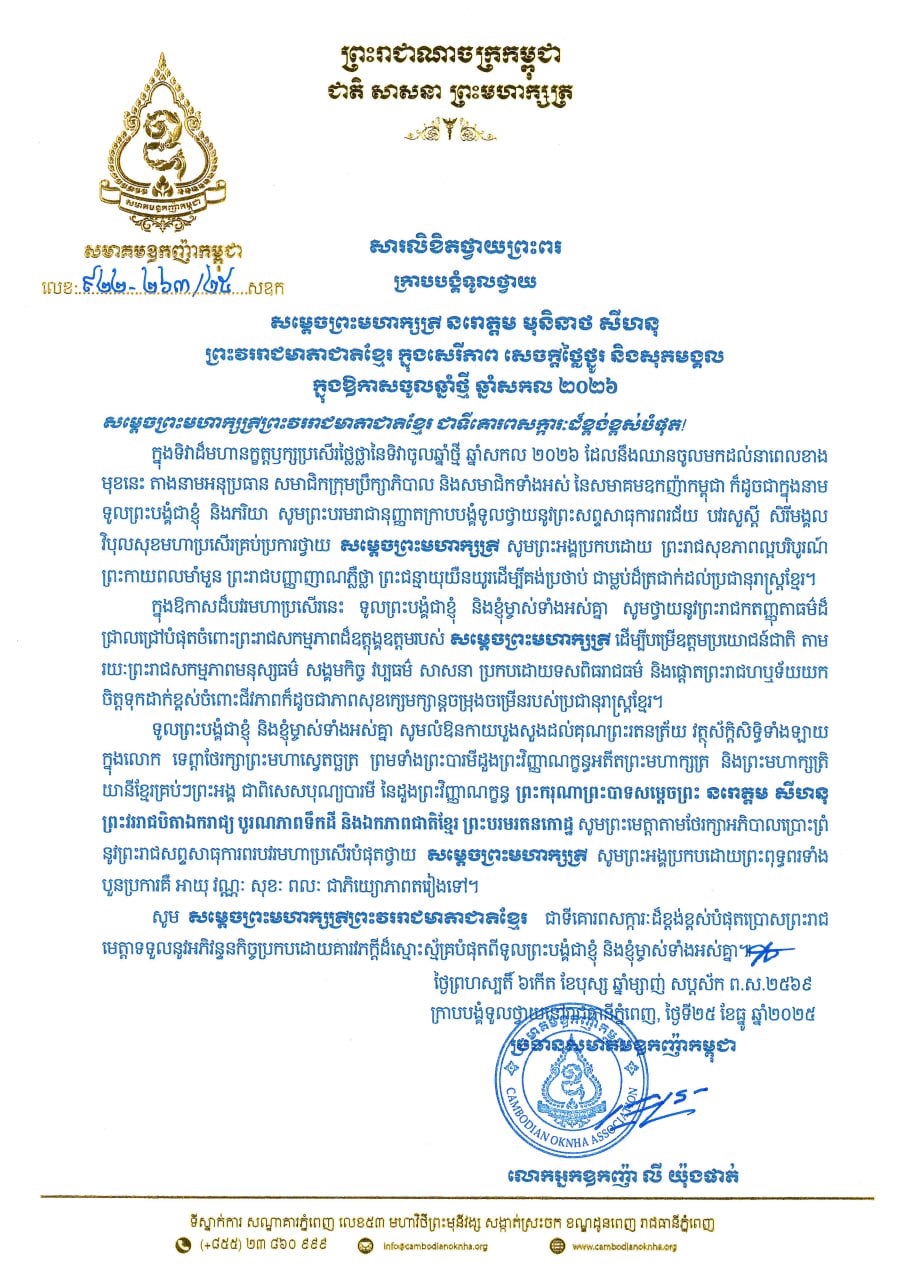 សមាគមឧកញ៉ាកម្ពុជា ផ្ញើសារលិខិតថ្វាយព្រះពរ សម្តេចព្រះមហាក្សត្រី នរោត្តម មុនិនាថ សីហនុ ព្រះវររាជមាតាជាតិខ្មែរ ក្នុងឱកាសឆ្នាំថ្មី ឆ្នាំសកល ២០២៦