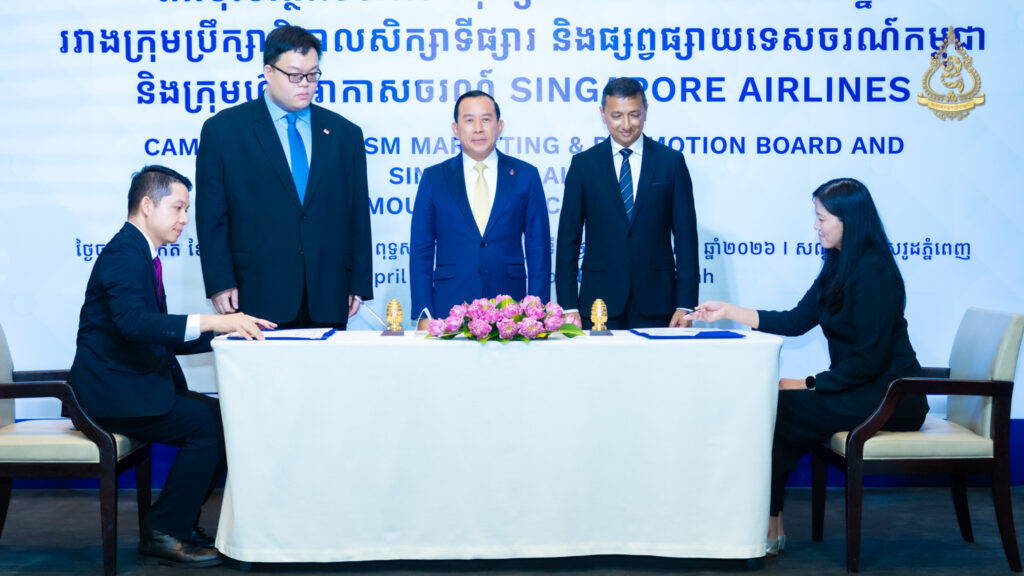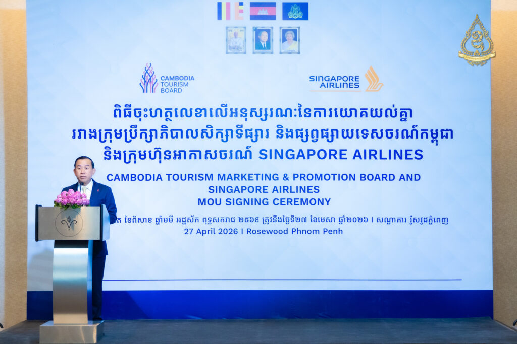ភ្នំពេញ៖ នាព្រឹកថ្ងៃ២៧ ខែមេសា ឆ្នាំ២០២៦ អ្នកឧកញ៉ា ហ៊ុន ឡាក់ អគ្គលេខាធិការ និងជាតំណាងលោកអ្នកឧកញ៉ា លី យ៉ុងផាត់ ប្រធានសមាគមឧកញ៉ាកម្ពុជា បានចូលរួមក្នុងពិធីចុះហត្ថលេខាលើអនុស្សរណៈនៃការយោគយល់គ្នា (MoU) រវាងក្រុមប្រឹក្សាភិបាលសិក្សាទីផ្សារ និងផ្សព្វផ្សាយទេសចរណ៍កម្ពុជា (CTB) និងក្រុមហ៊ុនអាកាសចរណ៍ Singapore Airline ក្រោមអធិបតីភាពឯកឧត្តម ហួត ហាក់ រដ្ឋមន្រ្តីក្រសួងទេសចរណ៍។