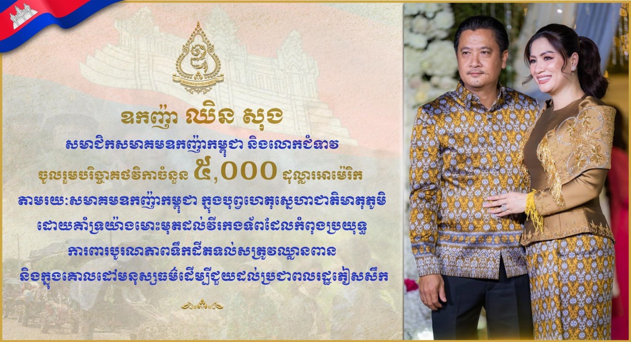 ឧកញ៉ា ឈិន សុង និងលោកជំទាវ ចូលរួមបរិច្ចាគថវិកា ៥,០០០ដុល្លារ តាមរយៈសមាគមឧកញ៉ាកម្ពុជា គាំទ្រយ៉ាងមោះមុតដល់វីរកងទ័ពជួរមុខ