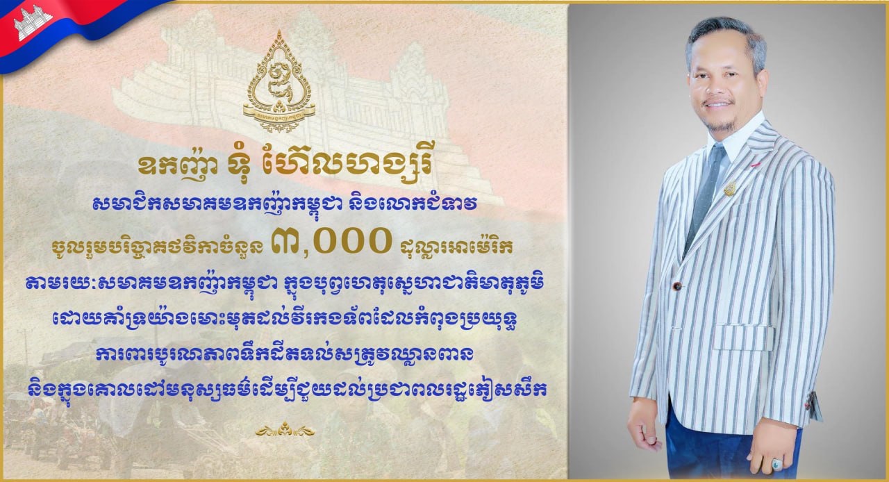 ឧកញ៉ា ទុំ ហ៊ែលហង្សរី និងលោកជំទាវ ចូលរួមបរិច្ចាគថវិកា ៣,០០០ដុល្លារ តាមរយៈសមាគមឧកញ៉ាកម្ពុជា គាំទ្រយ៉ាងមោះមុតដល់វីរកងទ័ពជួរមុខ