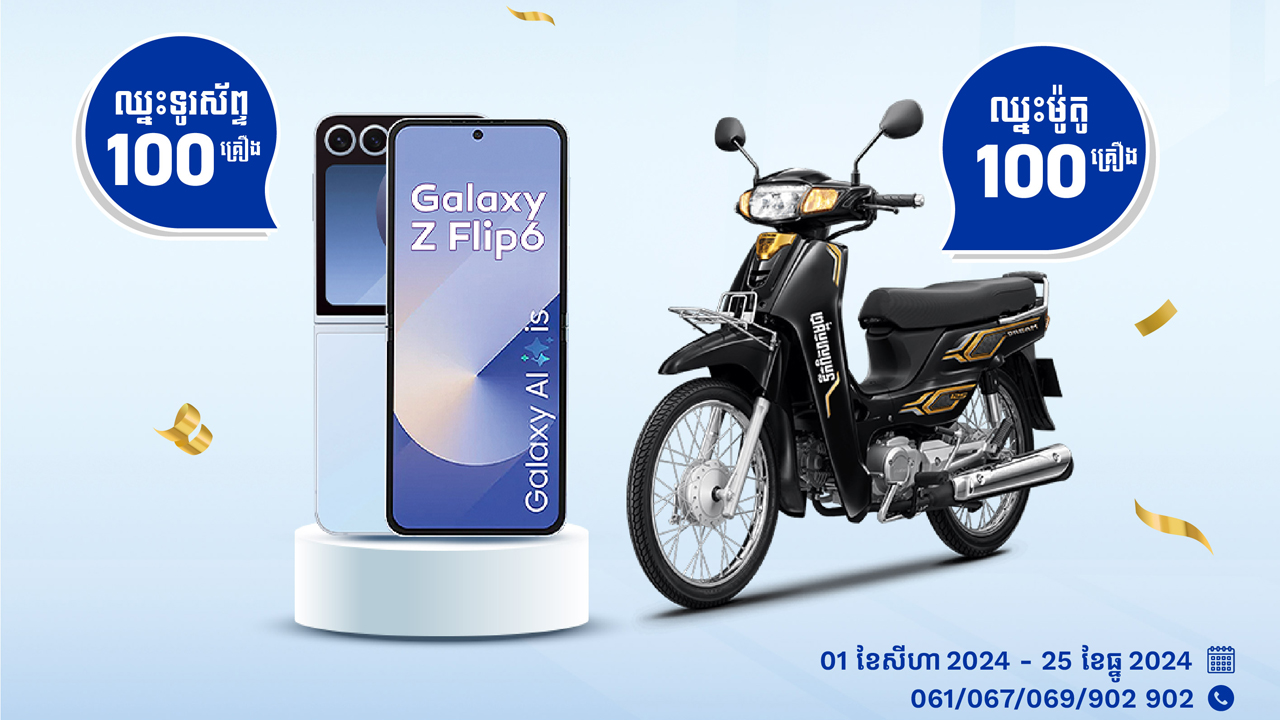 កៀកថ្ងៃមែនទែនហើយ! ទឹកពិសាកម្ពុជា ត្រៀមស្វែងរកអតិថិជនមហាសំណាង ក្លាយជាម្ចាស់រង្វាន់ធំ ទូរសព័្ទដៃ Galaxy Z Flip 6 ចំនួន ២០ រង្វាន់ និង ម៉ូតូ Honda Dream ចំនួន ២០ រង្វាន់ នាសប្តាហ៍នេះ!