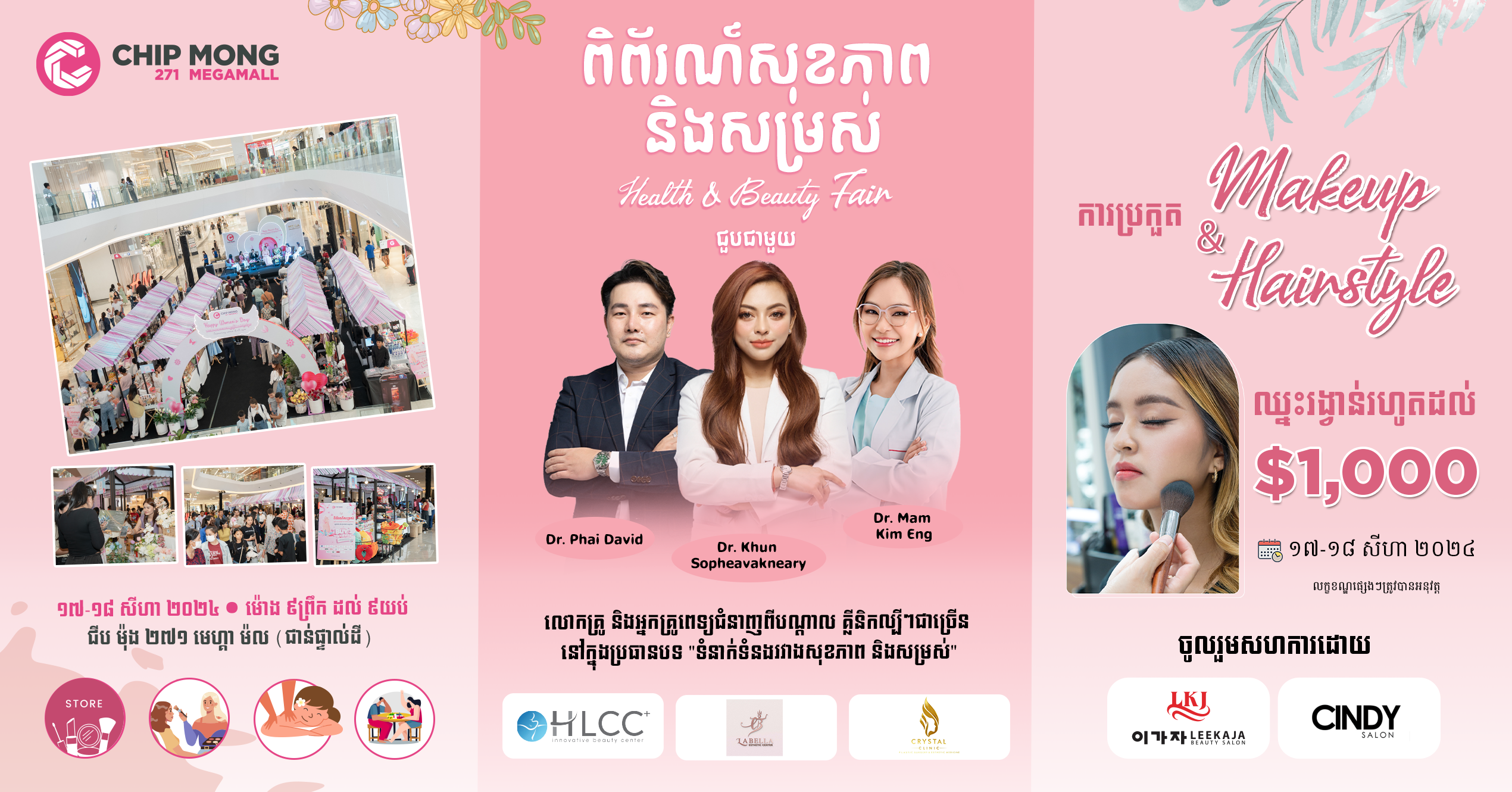 នាថ្ងៃទី១៧ និង ១៨ ខែសីហា ឆ្នាំ ២០២៤ ខាងមុខនេះ ផ្សារទំនើប ជីប ម៉ុង ២៧១ មេហ្គា ម៉ល ជាន់ផ្ទាល់ដី នឹងមានការរៀបចំ ពិព័រណ៍សុខភាព និងសម្រស់ ដោយនាំមកនូវកម្មវិធីជាច្រើនដូចជា៖ ការជជែកពិភាក្សាទៅលើសុខភាព និងសម្រស់ ពីវេជ្ជបណ្ឌិតល្បីៗ ការប្រកួតផាត់មុខ និងធ្វើសក់ ការបង្រៀនតិចនិកខ្លីៗ ពីការតុបតែងមុខ ការតាំងបង្ហាញផលិតផលជាច្រើន និងការលេងល្បែងកម្សាន្ត ដើម្បីឈ្នះរង្វាន់ទៀតផង។