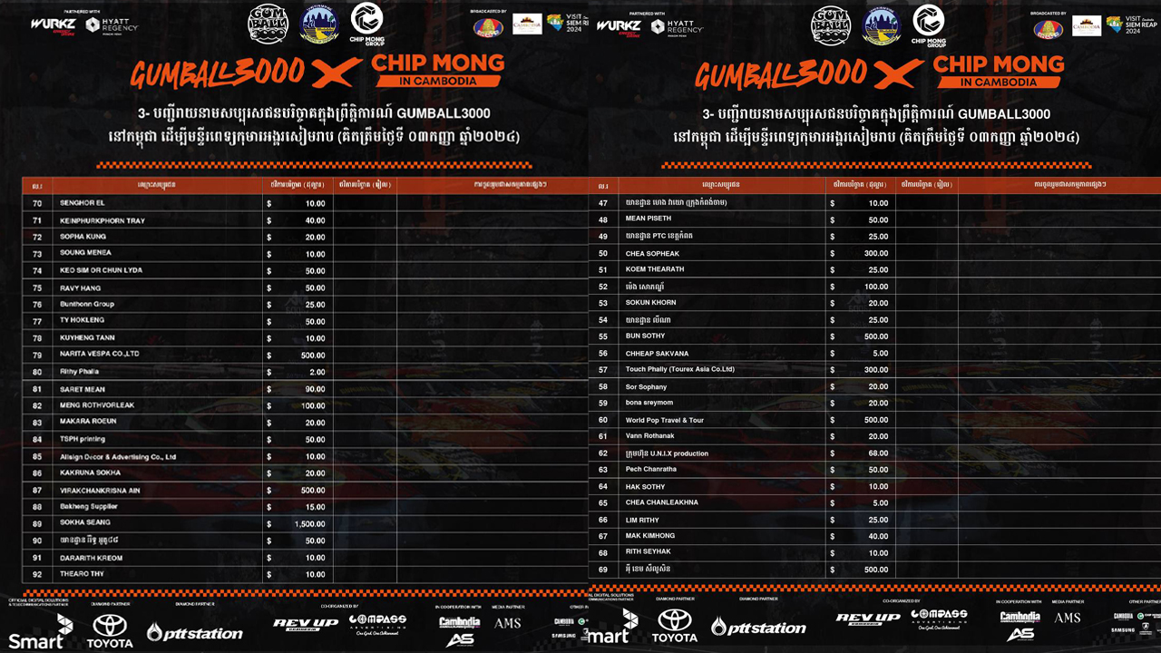 ក្នុងនាមជាដៃគូសហការផ្ដាច់មុខរបស់ GUMBALL 3000 ក្នុងការរៀបចំព្រឹត្តិការណ៍នេះនៅកម្ពុជា ដែលក្នុងនោះរួមមាន ឧកញ៉ា លាង ពៅ (ភីធើរ) ជាអគ្គនាយកពហុពាណិជ្ជកម្ម និងជាសមាជិកក្រុមប្រឹក្សាភិបាល ក្រុមហ៊ុន ជីប ម៉ុង ដែលមានការគាំទ្រពីឯកឧត្ដម គុជ បញ្ញាសារ រដ្ឋលេខាធិការ ក្រសួងទេសចរណ៍ តំណាងឯកឧត្ដម សុខ សូកេន រដ្ឋមន្ត្រីក្រសួងទេសចរណ៍រួមទាំងមន្ត្រី និងស្ថាប័ន ពាក់ព័ន្ធជាច្រើនរូប សូមថ្លែងអំណរគុណយ៉ាងជ្រាវជ្រៅដល់សប្បុរសជនដែលបានបរិច្ចាគថវិកាសម្រាប់ប្រើប្រាស់ និងគាំទ្រក្នុងសកម្ម ភាពរៀបចំព្រឹត្តិការណ៍ GUMBALL 3000 នៅកម្ពុជាដែលនឹងធ្វើឡើងនៅថ្ងៃទី ១៥-១៧ ខែកញ្ញា ឆ្នាំ២០២៤ ខាងមុខនេះ។