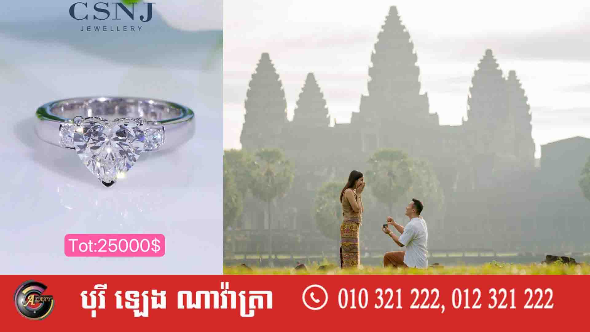 ចិញ្ចៀនពេជ្រម៉ូដបេះដូង ដ៏ស្រស់ស្អាត ដែលលោក លាវ វេងហួរ ទិញជូន កញ្ញា រឿន ណាត រៀបចំជាកាដូសារភាពស្នេហ៍ នៅមុខប្រាសាទអង្គរវត្ត នាទឹកដីខេត្តសៀមរាបនេះ មានតម្លៃរហូតដល់ ២៥,០០០ដុល្លារ នេះបើតាមការបញ្ជាក់ពីហាងពេជ្រ CSNJ ។