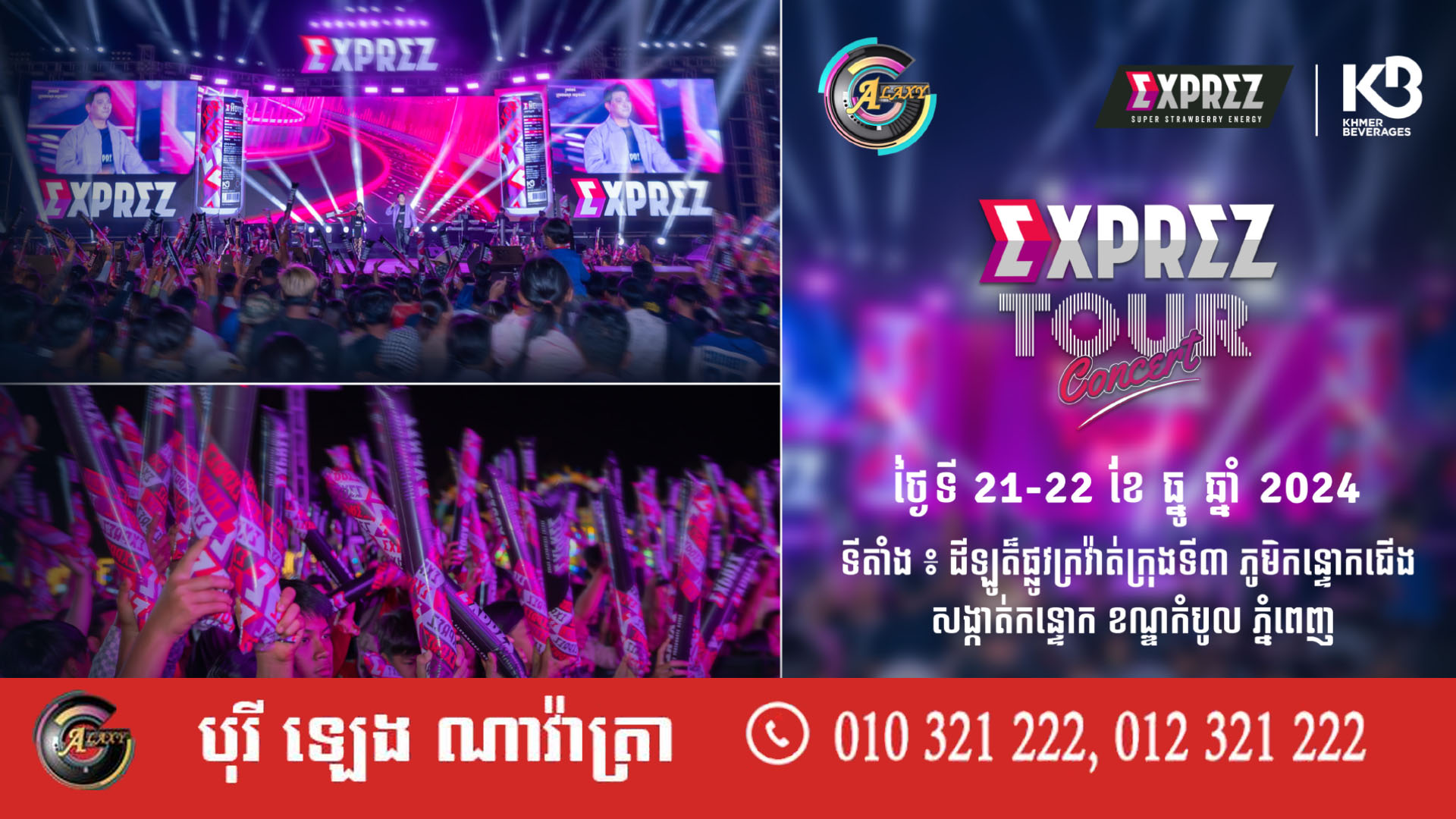 មហាព្រឹត្តិការណ៍ប្រគំតន្រ្តីប្រចាំប្រទេស Exprez Tour Concert របស់ ក្រុមហ៊ុនខ្មែរ ប៊ែវើរីជីស សហការជាមួយផលិតកម្មGalaxy Navatra បានធ្វើដំណើរមកដល់ខណ្ឌកំបូល រាជធានីភ្នំពេញហើយ ដោយការប្រគំតន្ត្រីខ្នាតយក្សមួយនេះ នឹងនាំយកកំពូលតារាចម្រៀងប្រចាំប្រទេសជាច្រើនដួង មកអង្រួនឆាក បង្កើតទស្សនីយភាពដ៏អស្ចារ្យ បម្រើអារម្មណ៍ពុកម៉ែបងប្អូន អាចចូលរួមទទួលយកភាពសប្បាយរីករាយ និងរាំលេងកម្សាន្ត ជាមួយនឹង ចង្វាក់ភ្លេងគ្រប់ស្ទាយ ព្រមទាំងបានជួបជាមួយអាយដលជាច្រើនដួងផងដែរ ។