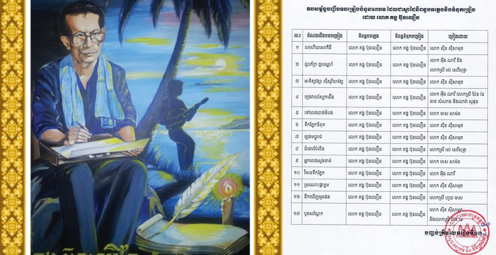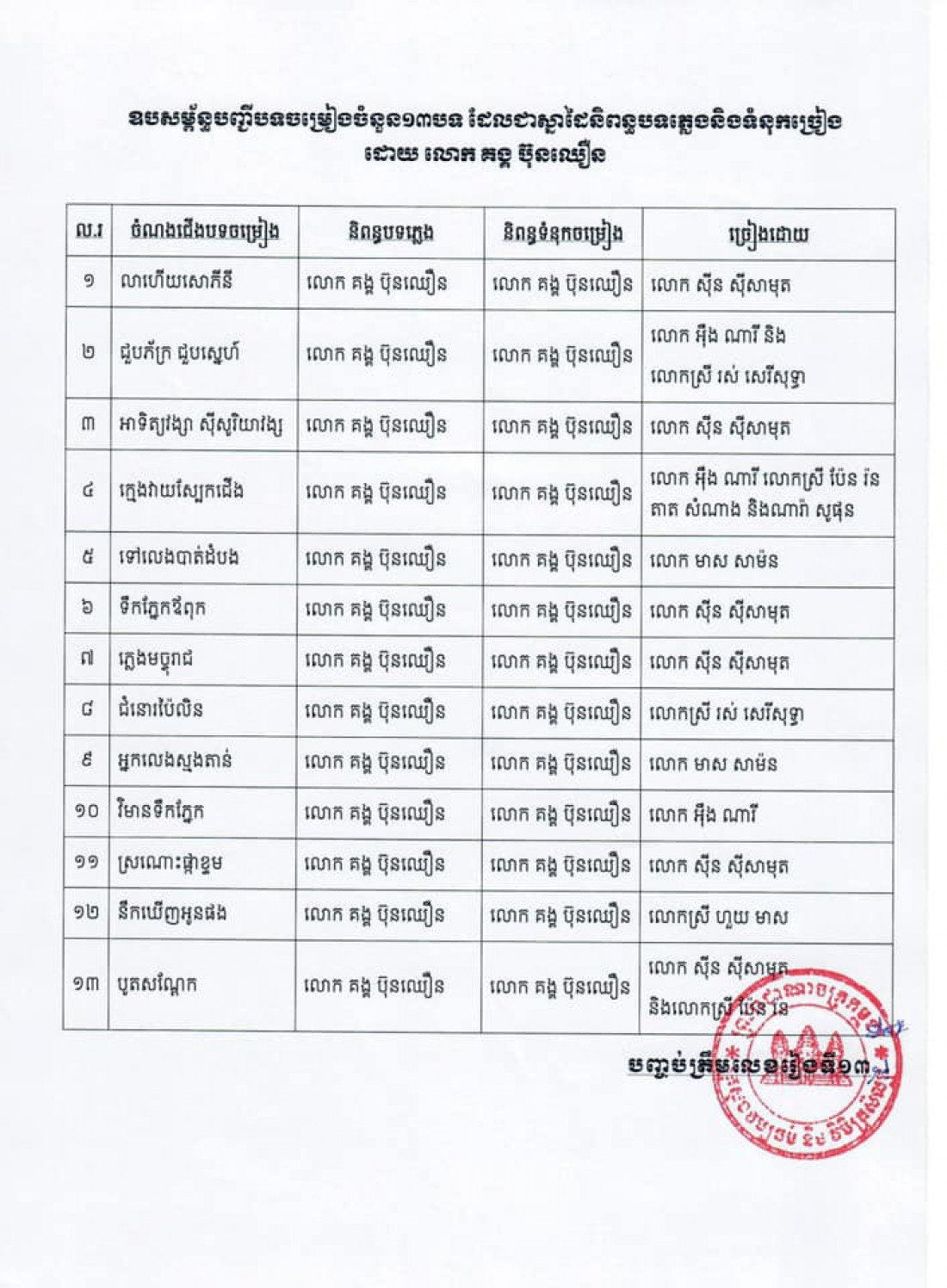 ក្រសួងបានឱ្យដឹងថា កន្លងទៅនក្រសួងបានទទួលសំណើសុំសិទ្ធិគ្រប់គ្រងបទចម្រៀងពីលោកស្រី គាត គីមលន លើបទចម្រៀងដែលជាស្នាដៃនិពន្ធរបស់កវី គង្គ ប៊ុនឈឿន។ ឆ្លងតាមការសិក្សាស្រាវជ្រាវ ក្រសួងបានពិនិត្យឃើញថា ចម្រៀង១៣បទខាងលើនេះ គឺជាស្នាដៃនិពន្ធបទភ្លេង និងទំនុកច្រៀងដោយលោក គង្គ ប៊ុនឈឿន។