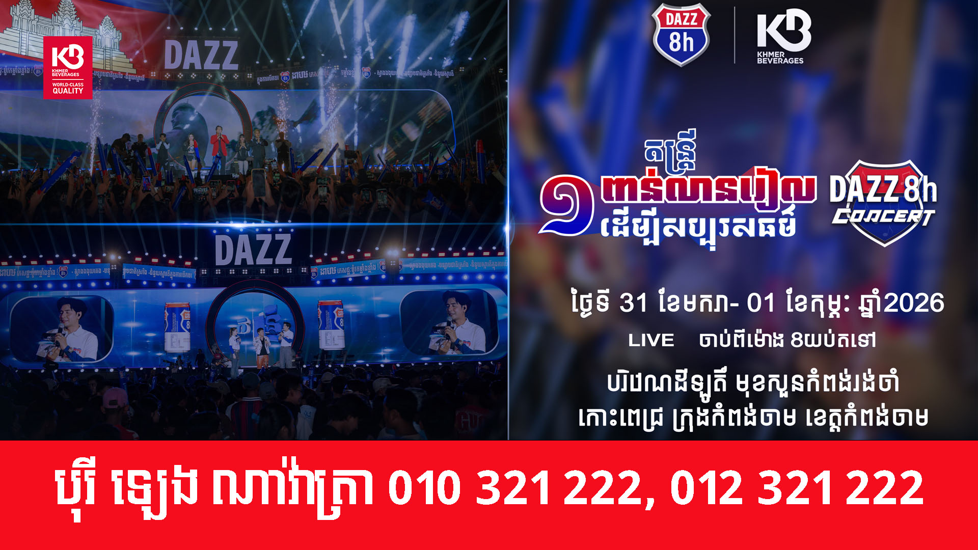 ព្រឹត្តិការណ៍ប្រគំតន្រ្តី DAZZ CHARITY CONCERT ទើបតែបញ្ចប់នៅ ស្រុកព្រៃឈរ ខេត្តកំពង់ចាម ហើយក៏បានបន្តដំណើរទៅក្រុងកំពង់ចាម ជាបន្តទៀតនៅបំណាច់ខែ មករា នេះ ដើម្បីនាំអារម្មណ៍ថ្មីប្លែកចែកររំលែកដល់ពុកម៉ែបងប្អូនដែលស្នេហាវិស័យចម្រៀង ។ តារាចម្រៀងដែលនឹងជួបពុកម៉ែបងប្អូននៅថ្ងៃទី ៣១ ខែ មករា ឆ្នាំ ២០២៦ នៅក្នុងព្រឹត្តិការណ៍ប្រគំតន្រ្តី DAZZ CHARITY CONCERT រួមមានកំពូលតារាចម្រៀង ឧកញ៉ា ខេមរៈ សិរីមន្ត , លោក ខេម ព្រមទាំងតារាចម្រៀងជាច្រើនរូបទៀត។ ដោយឡែកនៅថ្ងៃទី ១ ខែ កុម្ភះ ឆ្នាំ ២០២៦ឯណោះវិញជួបជាមួយកំពូលតារាចម្រៀង លោក ព្រាប សុវត្ថិ , លោក ខាន់ ជេមស៌ , លោក គូម៉ា និង សុវត្ថិ មុនីវណ្ណ …ព្រមទាំងតារាចម្រៀងវ័យក្មេង សំឡេងពិរោះជាច្រើនរូបទៀត ។