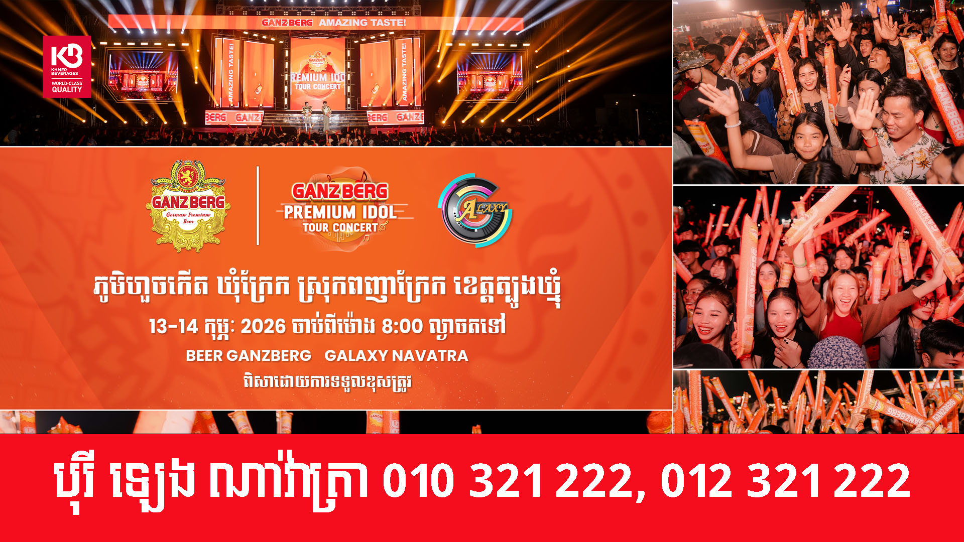 កំពូលតារាចម្រៀងដែលនឹងមកអង្រួនបេះដូងអ្នកគាំទ្រនៅលើទឹកដីខេត្ត ត្បូងឃ្មុំ ទីតាំងភូមិ ហួចកើត ឃុំក្រែក ស្រុកពញាក្រែក នៅថ្ងៃទី ១៣ ខែ កុម្ភៈ ឆ្នាំ ២០២៦ នេះ រួមមានកំពូលតារាចម្រៀង ឧកញ៉ា ខេមរៈ សិរីមន្ត ,លោក ខេម, កញ្ញា តន់ ចន្ទសីម៉ា, កញ្ញា លីដា និងតារាចម្រៀងវ័យក្មេងជាច្រើនរូបទៀតប្រចាំនៅក្នុងផលិតកម្ម ហ្គាឡាក់ស៊ី ណាវ៉ាត្រា ។ អ្វីដែលកាន់តែពិសេសជាងនេះទៅទៀតនោះនៅថ្ងៃទី ១៤ ខែ កុម្ភៈ ឆ្នាំ ២០២៦ នឹងជួបជាមួយការសម្តែង ច្រៀងរបស់តារាចម្រៀង Tempo , Pross La ,កញ្ញា ខាត់ សួស្តី និងតារាចម្រៀងវ័យក្មេងជាច្រើនរូបទៀតដែលនឹងមកអង្រួនឆាកតន្រ្តី GANZBERG PREMIUM IDOL TOUR CONCERT ឱ្យកក្រើកមេឃរញ្ជួយដីម្តង ដូច្នេះកុំភ្លេចណាត់ជួបគ្នានៅក្នុងថ្ងៃពិសេសនោះទាំងអស់គ្នា ។