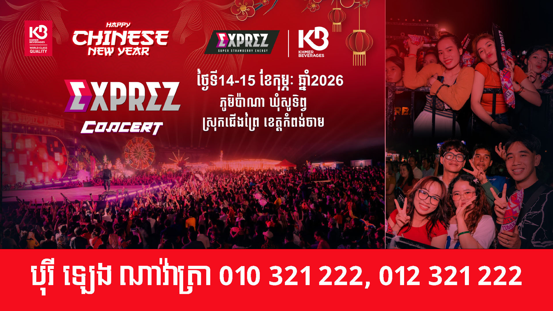 ថ្ងៃបុណ្យនៃក្តីស្រឡាញ់និងបុណ្យចូលឆ្នាំប្រពៃណីចិន នឹងឈានចូលមកដល់នាពេលប៉ុន្មានថ្ងៃនេះហើយ ហើយព្រឹត្តិការណ៍ប្រគំតន្រ្តី EXPREZ CHARITY CONCERT ក៏មានកាដូពិសេសៗជាច្រើនដើម្បីចែករំលែកដល់អ្នកគាំទ្រនៅលើទឹកដីស្រុកជើងព្រៃ ខេត្ត កំពង់ចាម ។