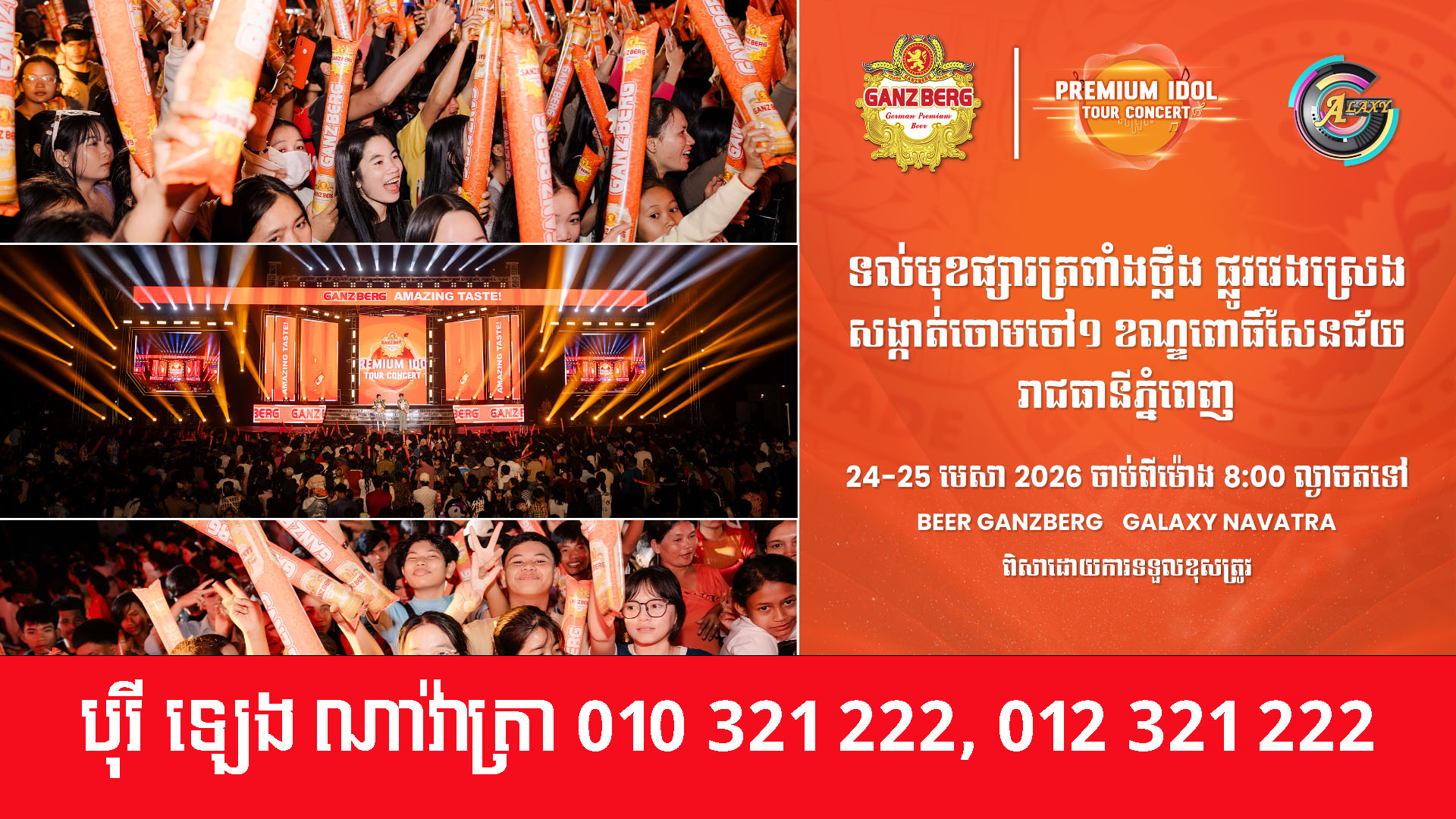 ក្រេបរសជាតិស្រាបៀរ GANZBERG ដ៏ឈ្ងុយឆ្ងាញ់កម្រិតពិភពលោក នៅក្នុងព្រឹត្តិការណ៍ប្រគំតន្រ្តី GANZBERG PREMIUM IDOL TOUR CONCERT នៅទីក្រុងភ្នំពេញទាំងអស់គ្នារយៈពេល២ថ្ងៃជាប់គ្នា ។ ចូលរួមការប្រគំតន្រ្តីដោយឥតគិតថ្លៃ គ្រាន់តែណាត់មនុស្សជាទីស្រឡាញ់ មិត្តភក្តិ និងបងប្អូនជុំគ្នារាំសប្បាយនាចុងសប្តាហ៍ ៕